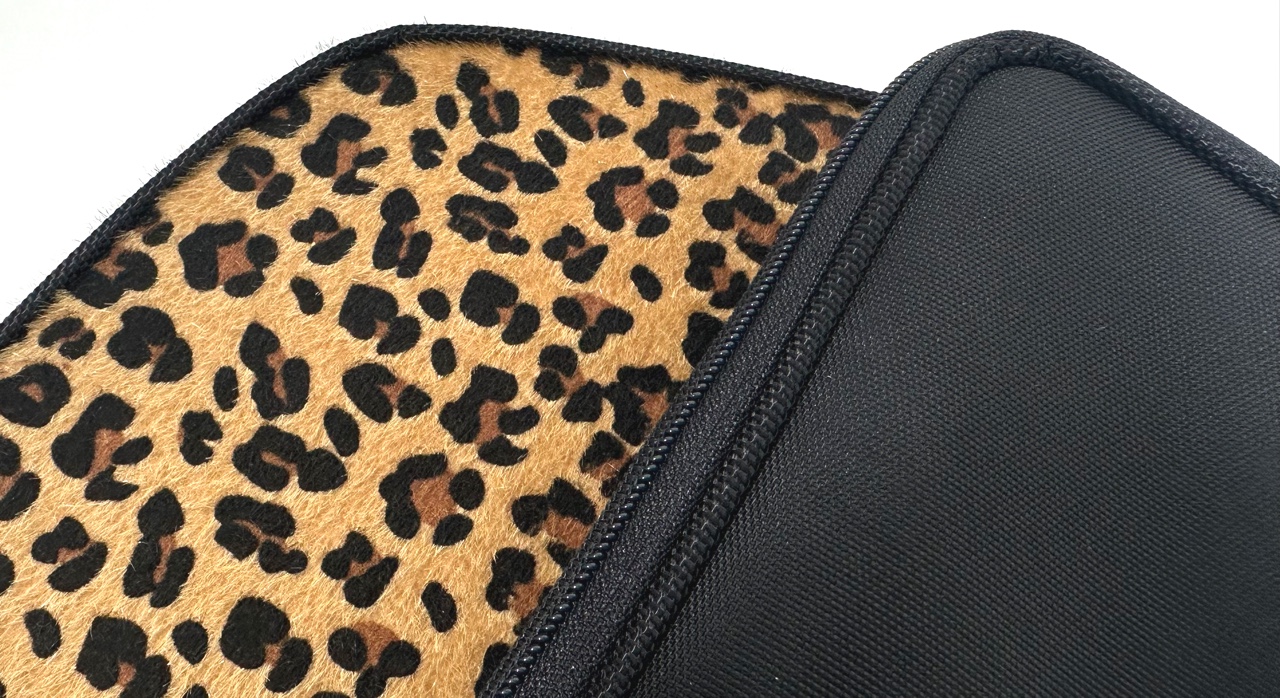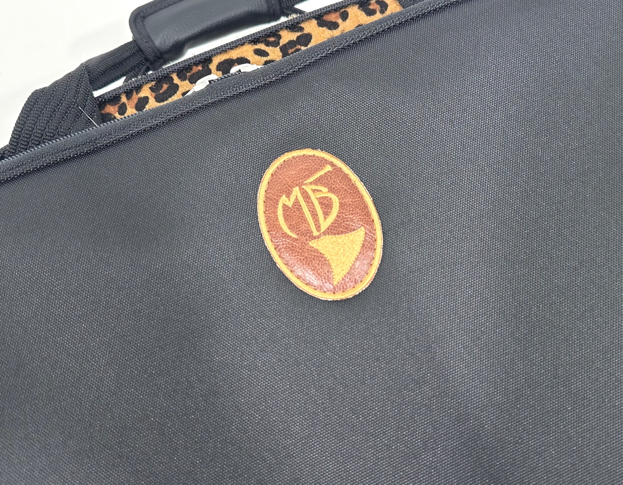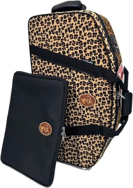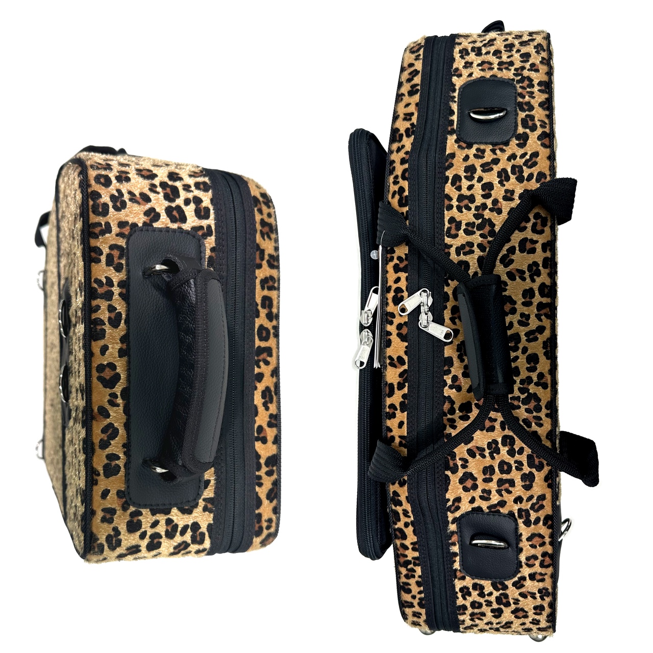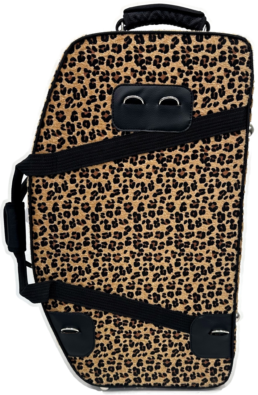 トリム/ロゴ:ブラック/ブラウンレザーロゴ 背面:レオパード 側面(下蓋):レオパード 側面(上蓋):レオパード 譜面バッグ:ナイロン/ブラック 前面:レオパード