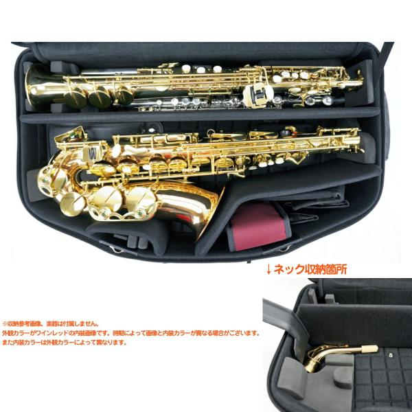 ■管楽器 木管楽器 アルトサックス、ソプラノサックス用 セミハードケース ■アルトサックス 1本 + ソプラノサックス(デタッチャブルネック) 1本 Alto Sax / Soprano Sax(detachable neck) (同モデル2本という組み合わせでは収納できません。)