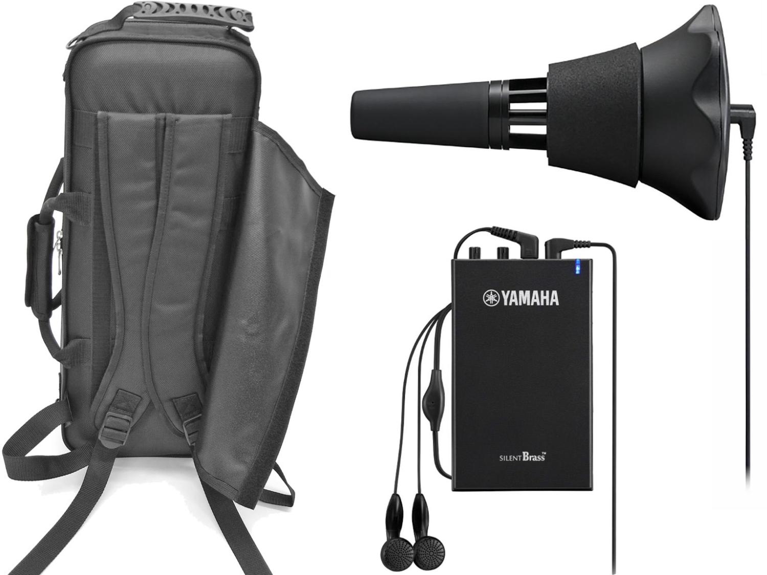 サイレントブラスは専用ミュートを手持ちの楽器のベルに装着し、専用機器を接続することによってイヤフォンから音をきいて演奏できるだけでなく同時に音量を抑えることができるヤマハの製品です。