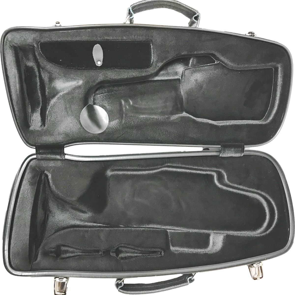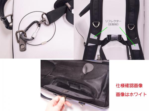 マウスピースは2本収納することができ、ウォーターキイ部分は穴あき防止のために補強されています。金具類もジャストサイズで歩くときのガチャガチャ音が鳴りにくいです。楽器を背負っているときにショルダーベルトの金具が外れないように、予備のフックが初めから付属。