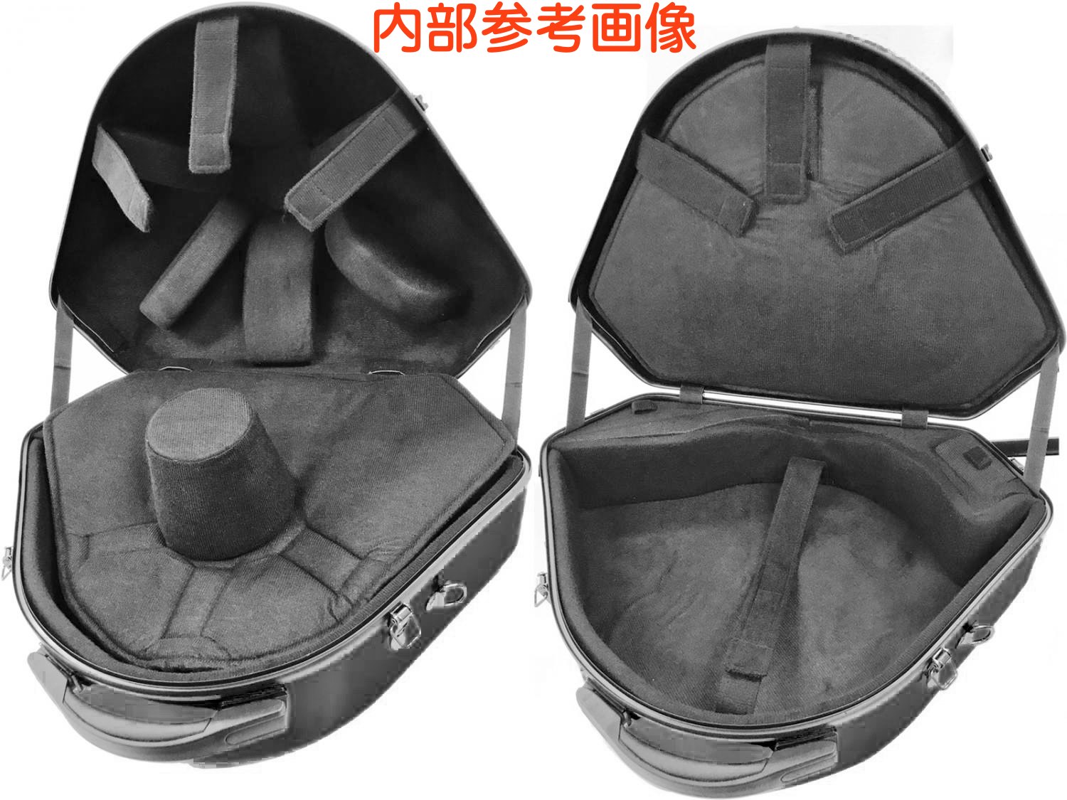 ベルをサポートするクッションが調節可能、本体側は厚さの違うクッションの入換えにより、アメリカンタイプ、ヨーロピアンタ イプ共にほとんどのメーカーのベルカットホルンを収納することができます。マウスピースを入れるポーチ/小物入れも付いています。