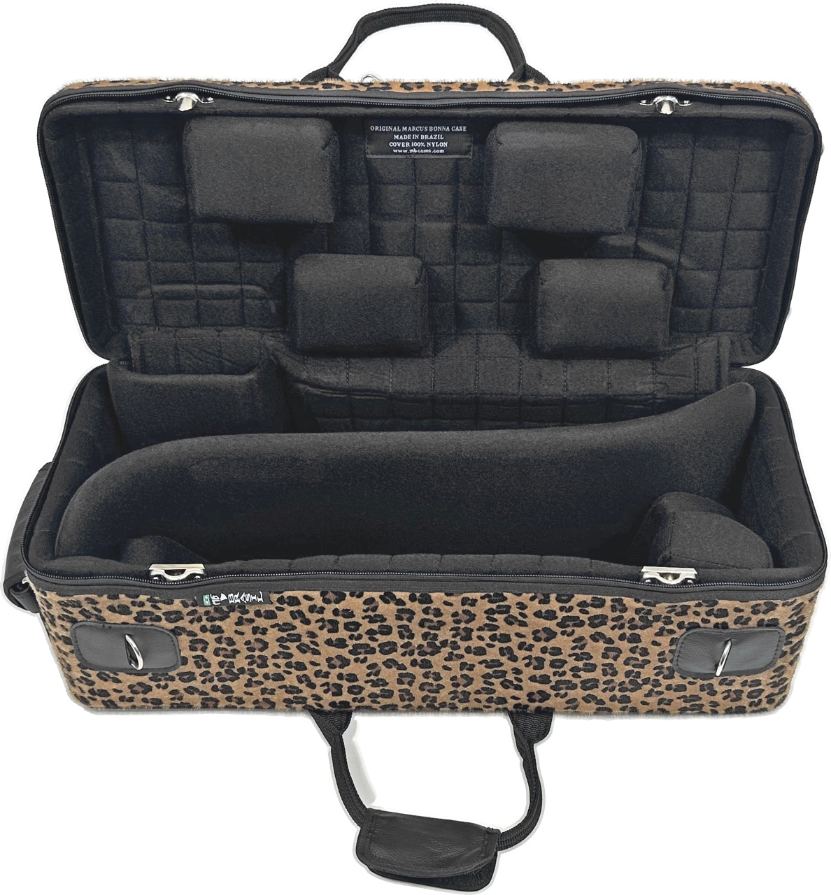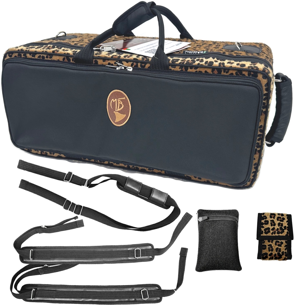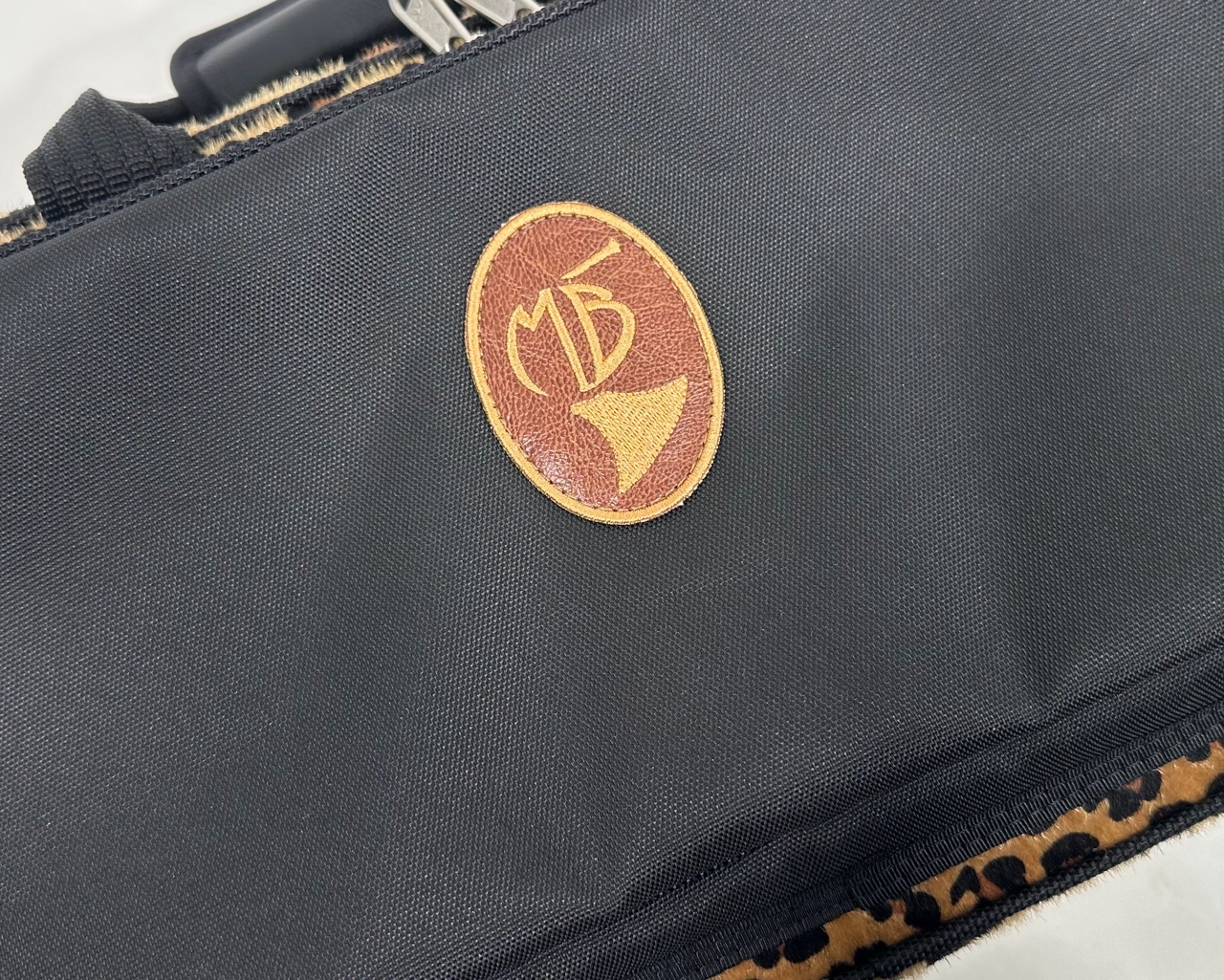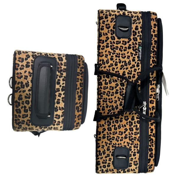 ■管楽器 金管楽器 セミハードケース ダブルケース ■カスタマイズ内容 トリム/ロゴ:ブラック/ブラウンレザーロゴ 背面:レオパード 側面(下蓋):レオパード 側面(上蓋):レオパード トリムと前面ポケットの間:レオパード 前面ポケット:ナイロン/ブラック
