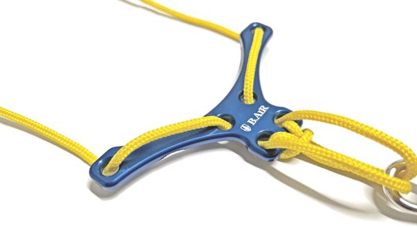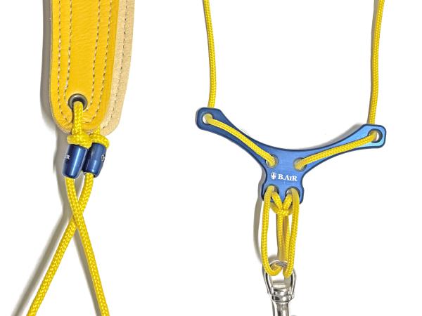 メーカーカタログ品番BSN-ASのV型プレートとブレードクリンチをブラックからブルーに、またブレード(紐)を変更、 パッドをカラーパッドのサン(イエロー)へカスタムパーツを組み合わせて作成したオリジナルの組み合わせストラップ