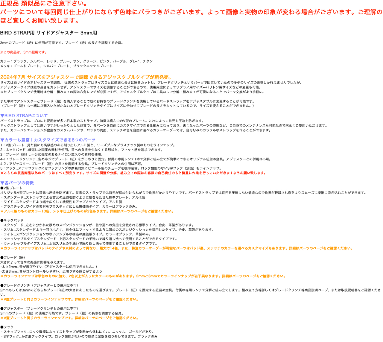 また単体でアジャスターとブレード(紐)を購入することで既にお持ちのブレードクリンチを使用しているバードストラップをアジャスタブルに変更することが可能です。
