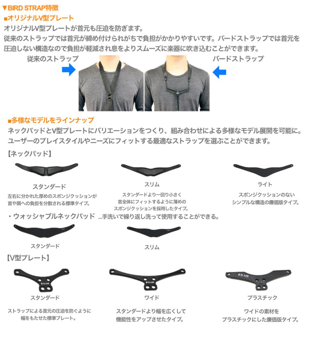 オリジナルV型プレートは首元も圧迫を防ぎます。従来のストラップでは首元が締め付けられがちで負担がかかりやすいです。バードストラップでは首元を圧迫しない構造なので負担が軽減され息をよりスムーズに楽器に吹き込むことができます。