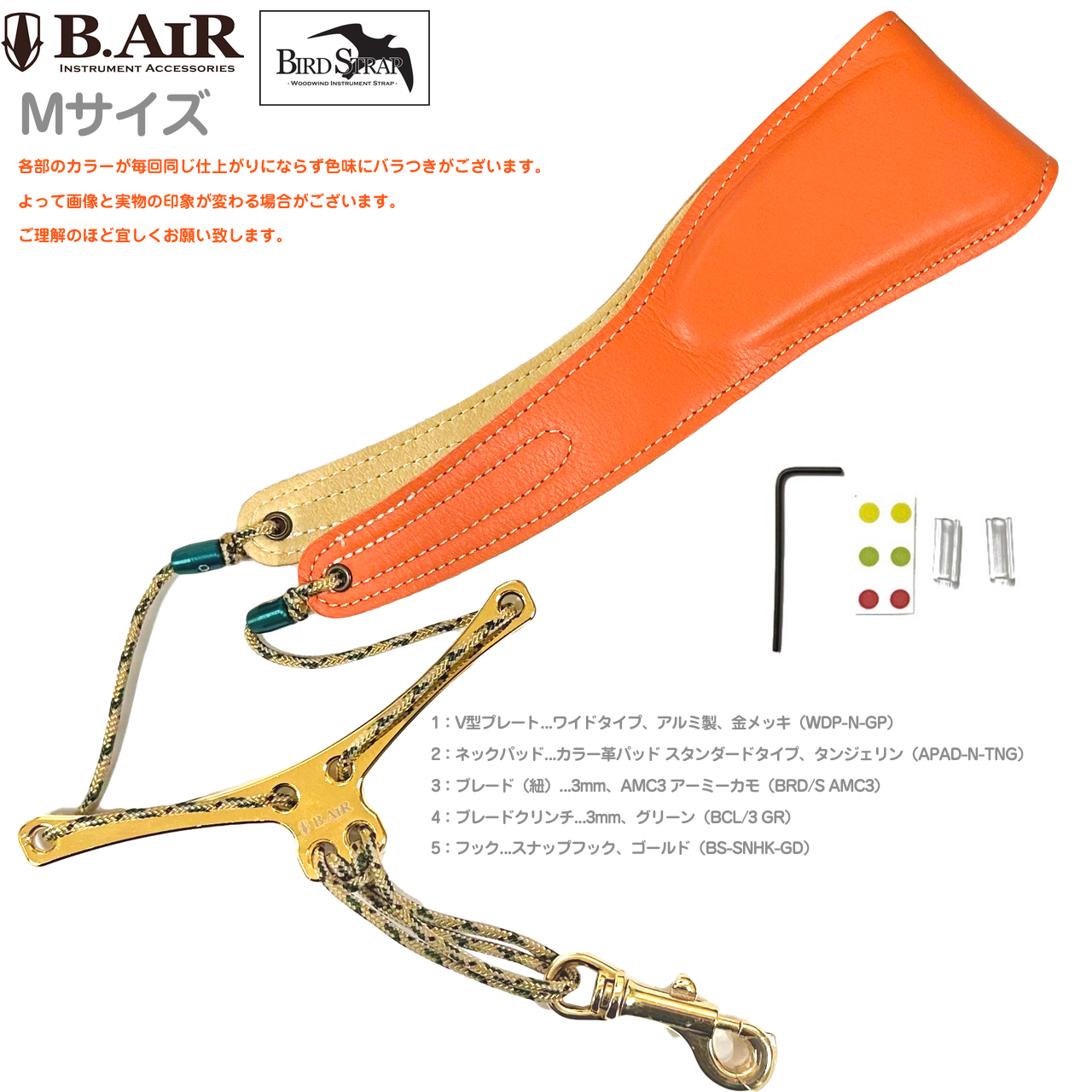 B.AIR ビーエアー バードストラップ カスタマイズ タンジェリン オレンジ ゴールド アーミーカモ サックス Mサイズ 3mm ストラップ BIRD STRAP sax 北海道 沖縄 離島不可オレンジ系 Wide ワイド アルミ製プレート スナップフック 革製 Alto Tenor sax