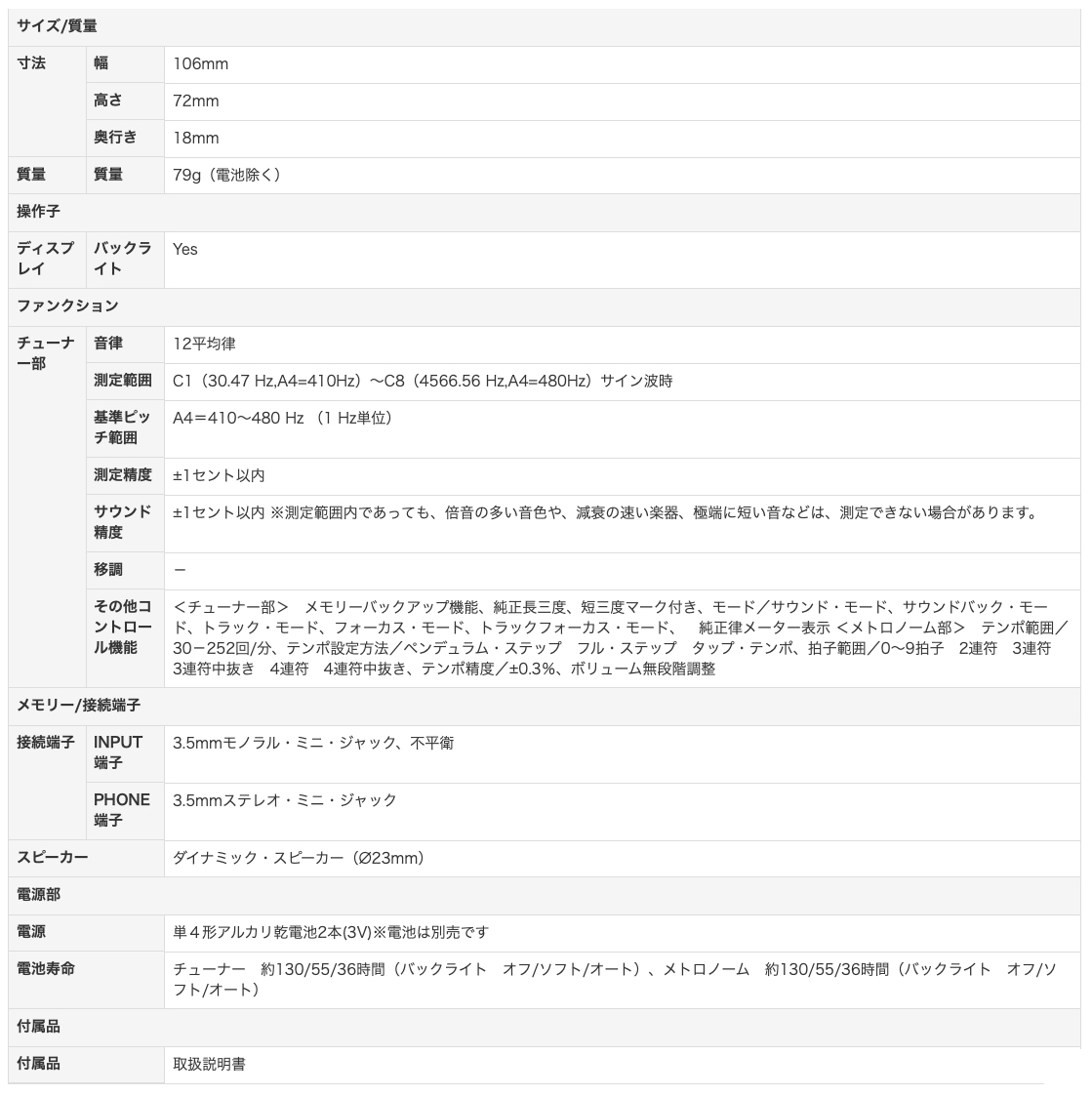 ■サウンド精度:±1セント以内 ※測定範囲内であっても、倍音の多い音色や、減衰の速い楽器、極端に短い音などは、測定できない場合があります。