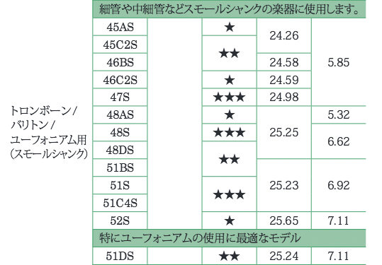 51のリムにやや浅いカップを持ち,迫力のある演奏が可能。オーケストラ奏者や吹奏楽のユーフォニアム奏者に好まれる。