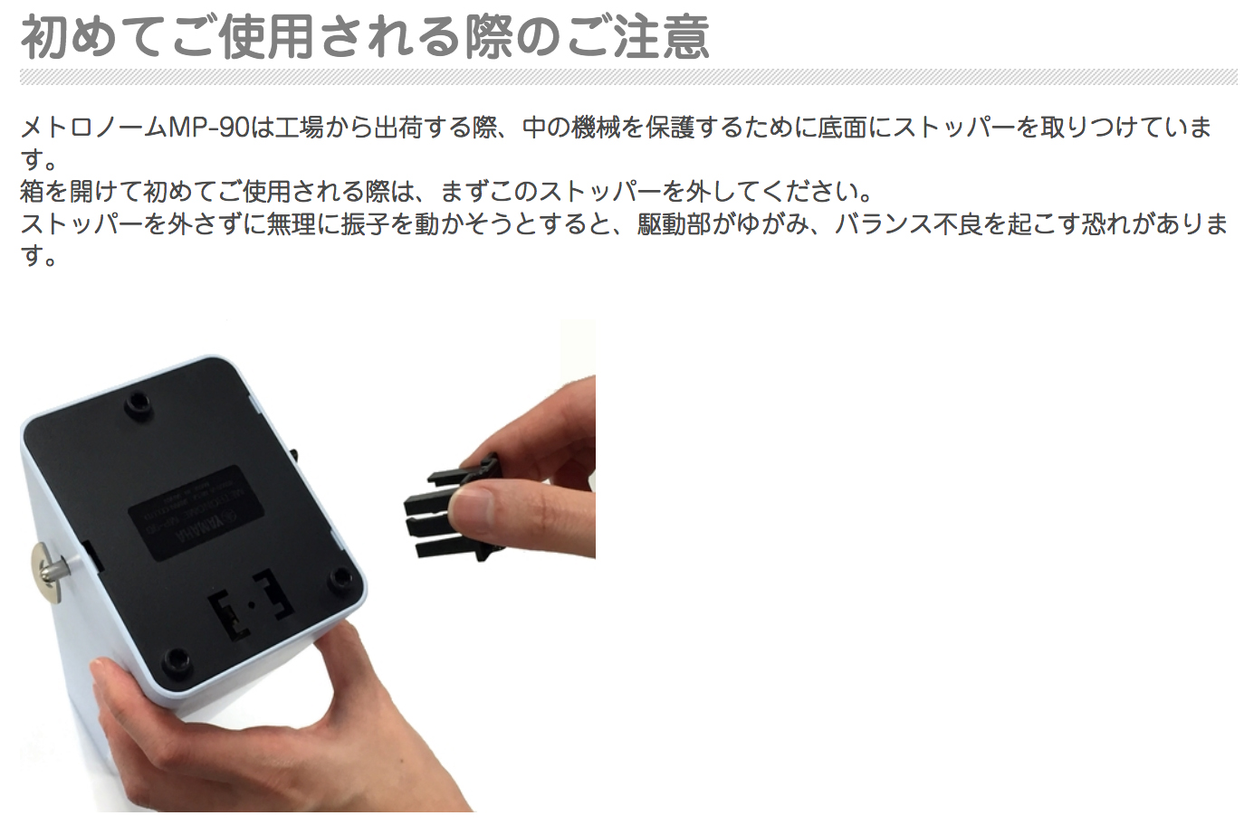 メトロノームMP-90は工場から出荷する際、中の機械を保護するために底面にストッパーが取りつけられています。 仕様について【テンポ】...一番遅いのが、4分音符が1分間に40個。41回という設定がなく、飛び飛びに208回まで39種類の設定ができます。主に楽譜の「速度記号」にそっています。 【ビート】...音が2種類確認できますが、「0」は1種類のみの音になります。4分の4であれば「4」に設定すれば小節の頭で1音だけ音色が変わってきこえますので、どこが頭かが分かりやすくなります。3拍子なら「3」と譜面に合わせて設定するのが基本です。ただし、変拍子だと曲の途中で変わりますので「0」の設定が良いかもしれませんね。