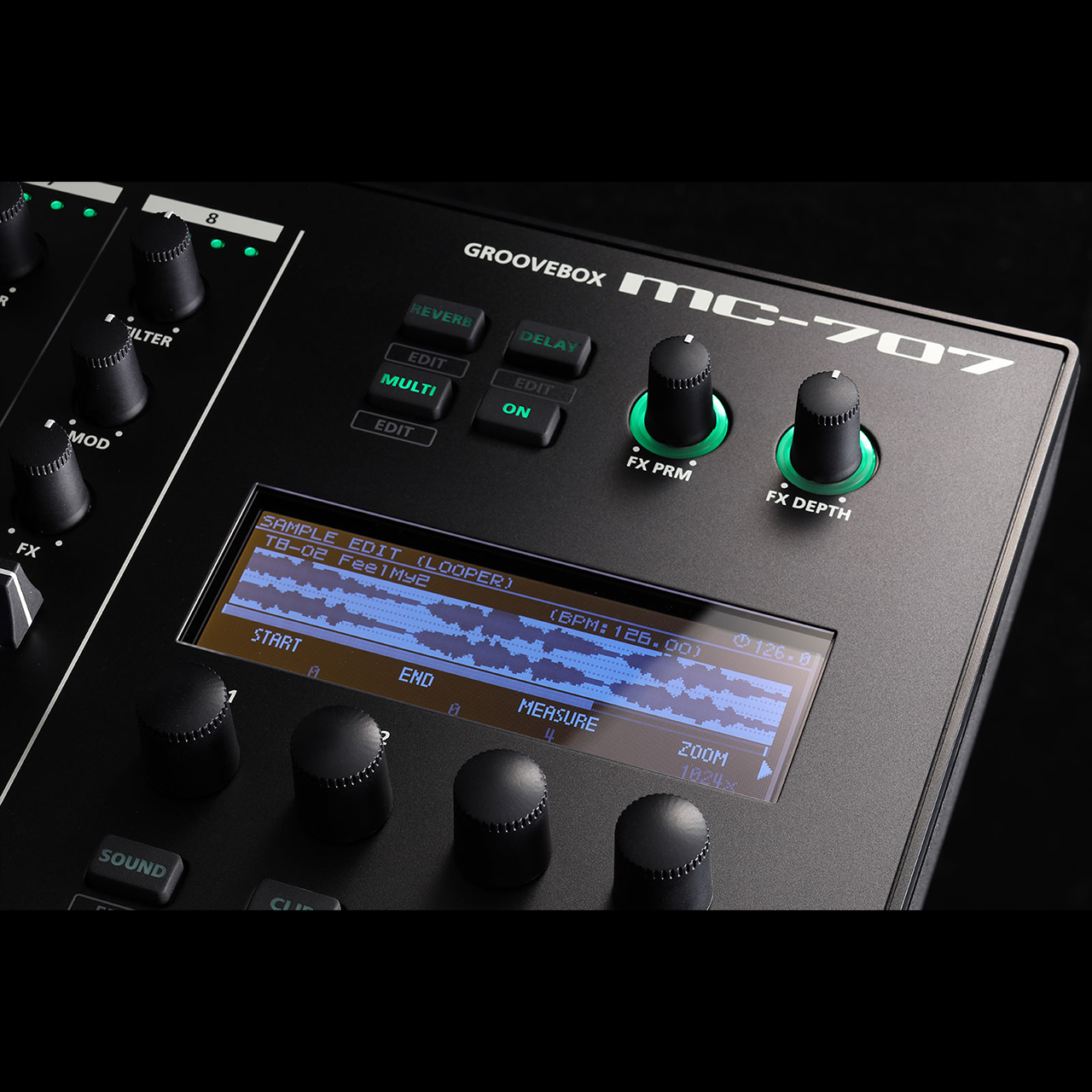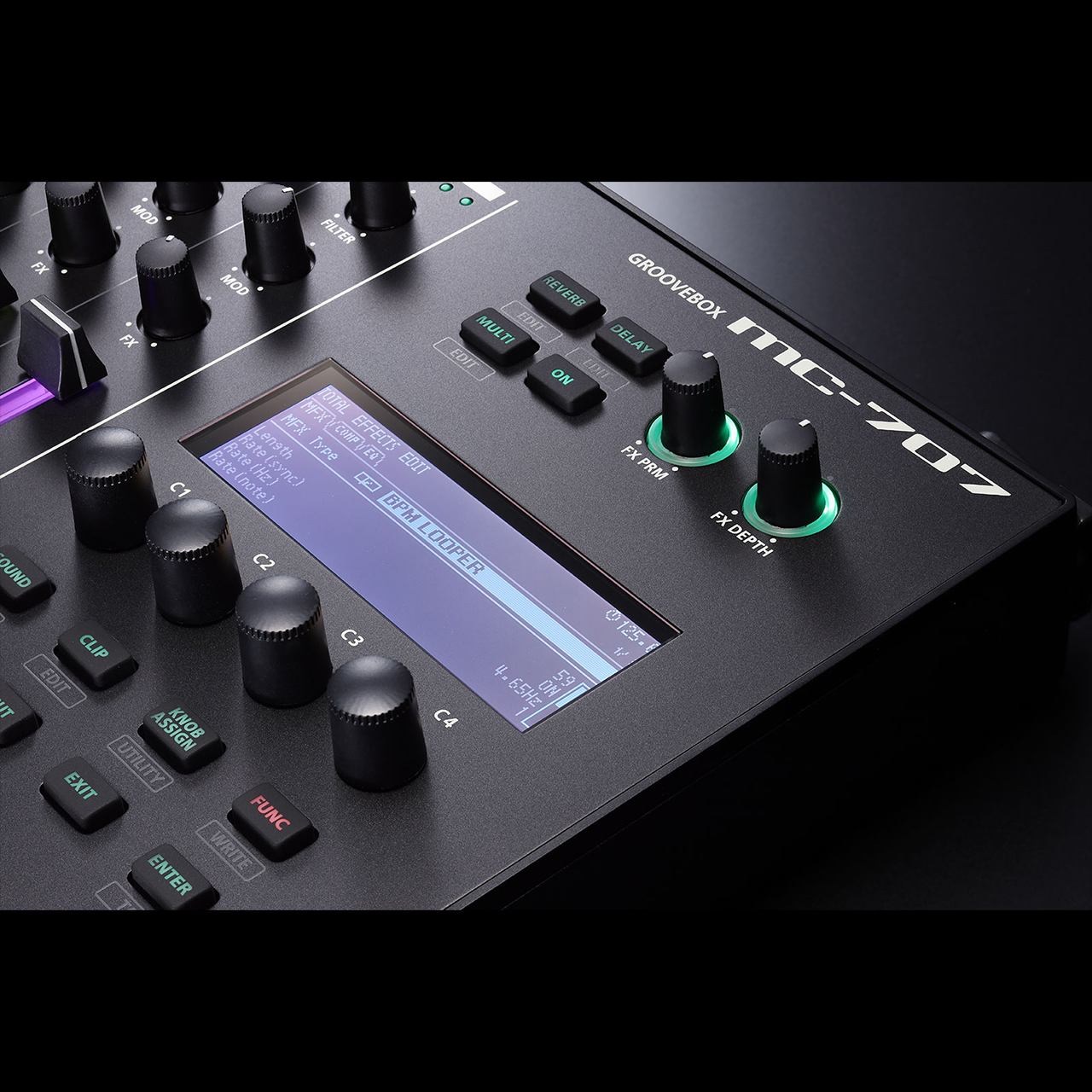 MC-707は、エレクトロニック・ミュージックの楽曲制作やライブ・パフォーマンスに必要な機能をすべて備えた、最新のGROOVEBOX。