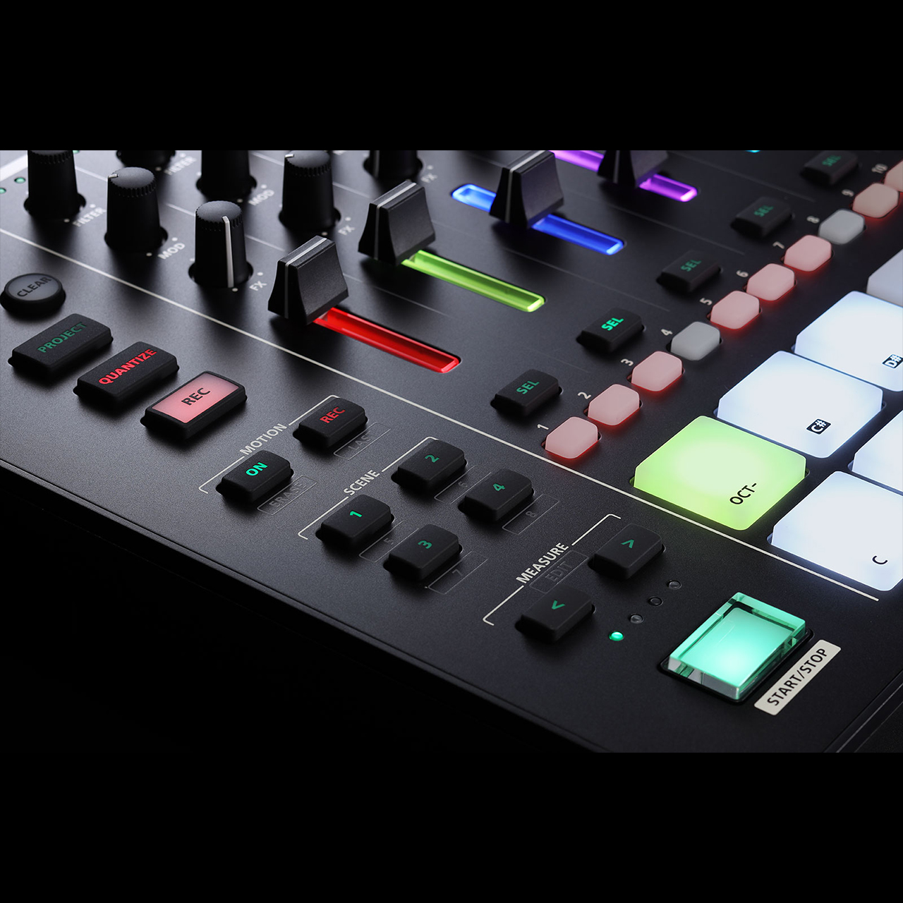 中央に設置されたスライダーで各パートのボリューム・アレンジを瞬時に行い、自由にパラメーターをアサインしたノブで音色変化を自在にコントロール。ノブやスライダーの操作はMOTIONとして各CLIPに記録し、自由なタイミングで再生・停止することが可能です。