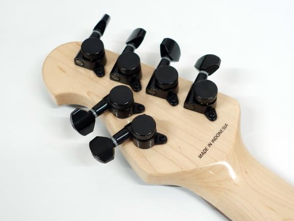 フィンガーボードにJPインレイとヘッドフェイスにはジョン・ペトルーシのサインがプリントされ、ブラック・カラーのハードウェアによって精悍なルックスに仕上がっています。