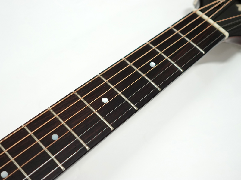 グロス仕上げのボディにサウンドホールにはマザー・オブ・パールが、ヘッドトップにはローズウッドが採用され高級感もあるルックス。