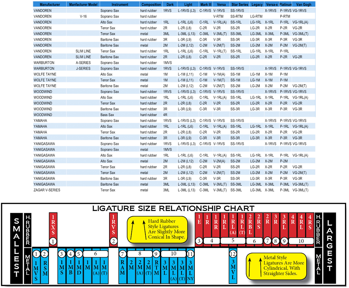 ・2本...リガチャーに重さが出るため吹き心地がやや重くなり暗い音色になる傾向です。ネジの締め具合で上下を変えることで音色の微調整ができるとされています。