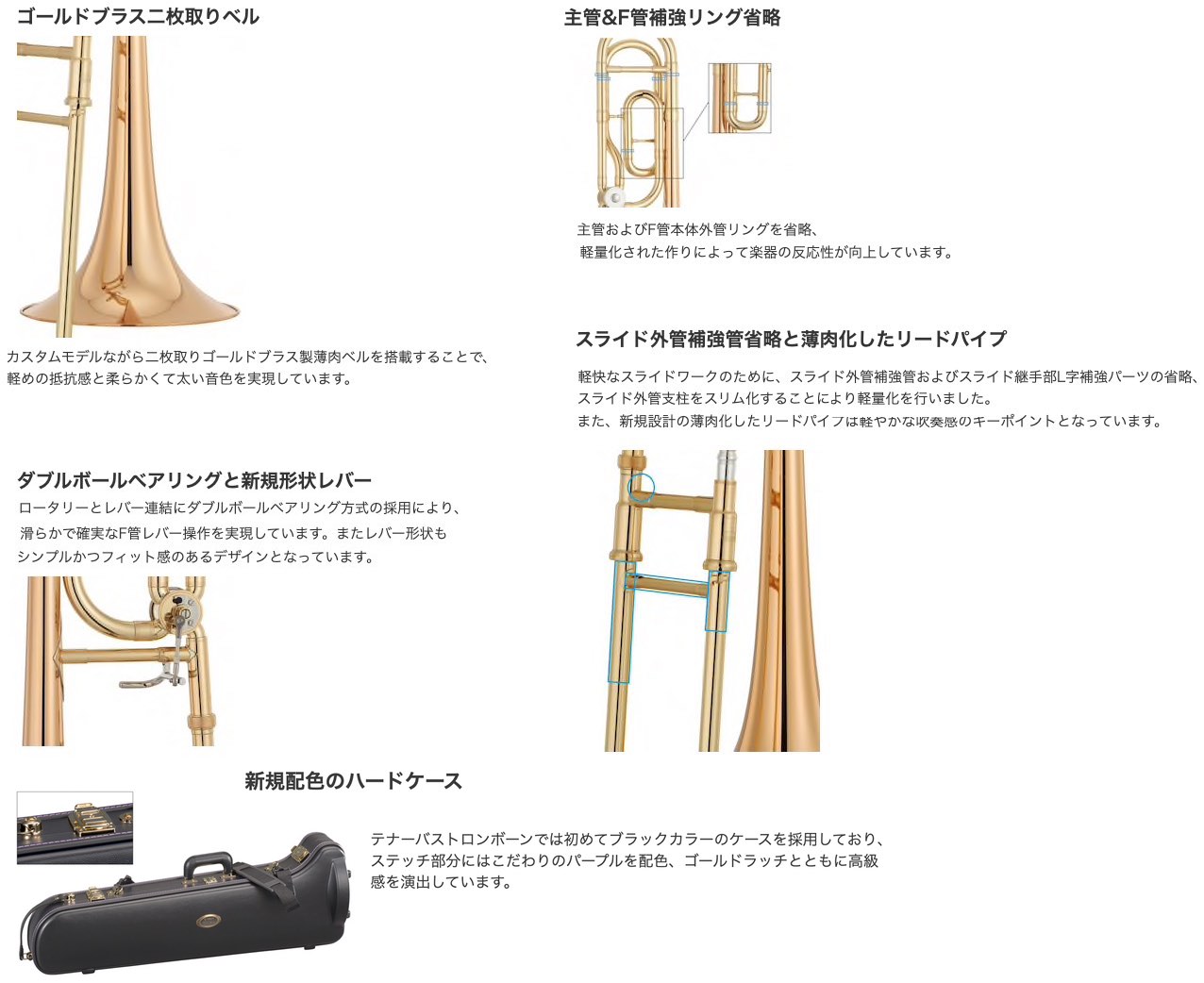 ヘビータイプが主流の吹奏楽現場において演奏時に負荷を抑えた上で鳴らすことの出来るテナーバストロンボーンを求める声は以前から多くあり、また細管テナートロンボーンが多く使用されるジャズシーンにおいても、音質要求から太管を使う奏者が増えてきている中、双方のニーズを満たす形で開発されたのがYSL-823Gです。ライトで明るい音色を嗜好する吹奏楽部員やジャズ奏者をはじめとするスタジオプレーヤーにもおすすめのモデルです。管体は通常洋白素材が使用される部分も含めて主要部分を真鍮製にし、カスタムながら二枚どりゴールドブラス製薄肉ベルを搭載することで軽めに抵抗感と柔らかくて太い音色が鳴る傾向です。本体外管リングの省略などによる軽量化で中高吹奏楽部員や女子学生でも軽快な操作性と軽やかな吹奏感や多彩な音色表現が得られます。