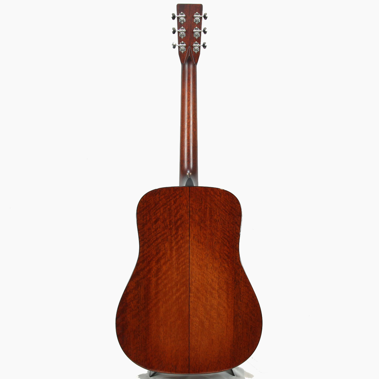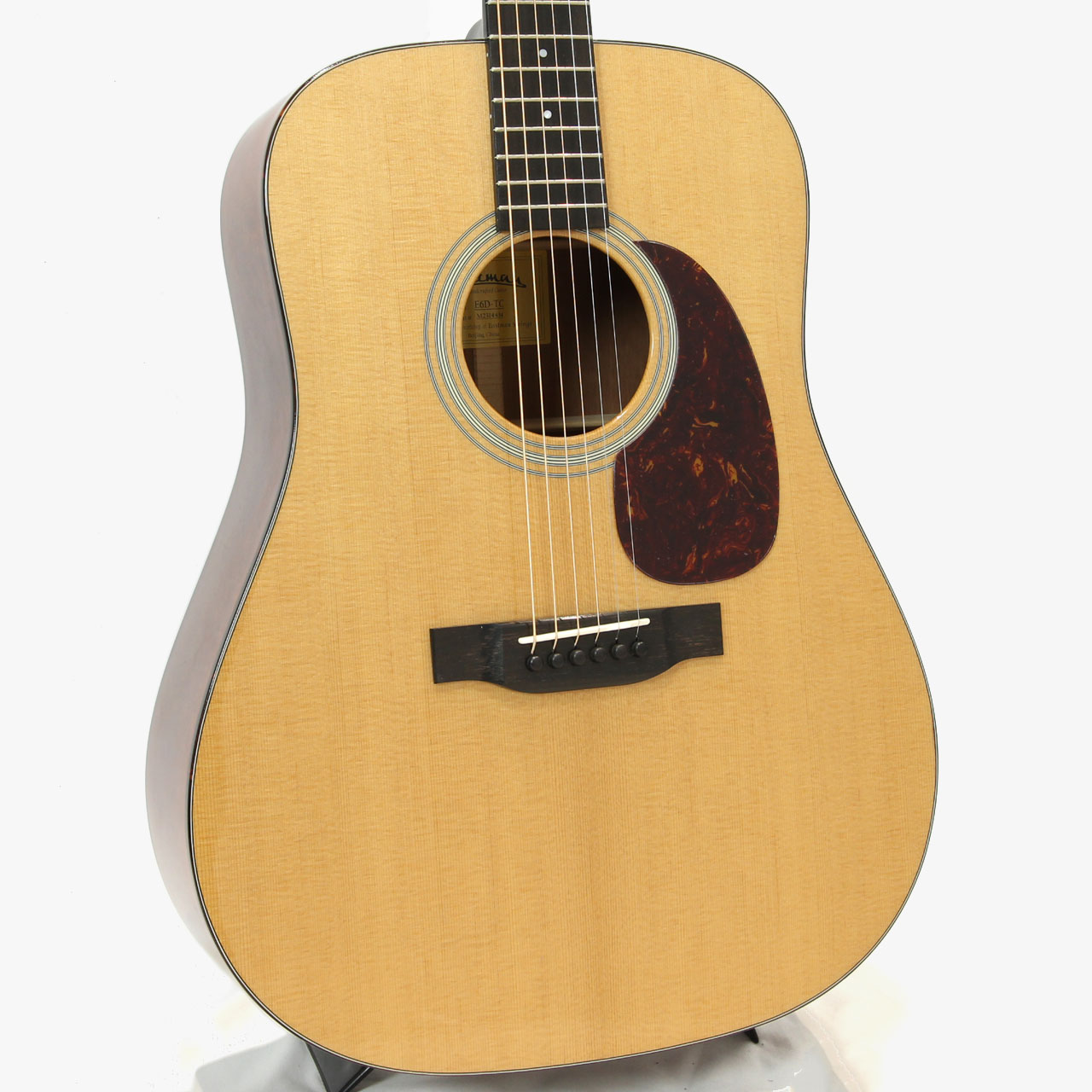 こちらはD-18スタイルで、サーモキュアド・シトカスプルー材トップ仕様のE6D-TC。サイドバック材には非常に美しいフィギュアードのマホガニーを使用した、見た目もとても美しいモデルです。