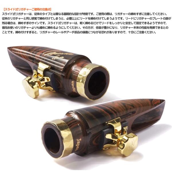 スライド式リガチャーは、従来のタイプとは異なる画期的な設計が特徴です。ご使用の際は、リガチャーの締めすぎに注意してください。従来のリガチャーと同じ感覚で締め付けてしまうと、必要以上にリードを締め付けてしまうようです。