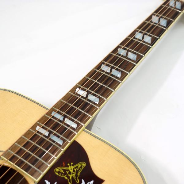 固定サドルですのであまりジャキジャキせず、フィンガーでもストロークでもバランス良く鳴ってくれます。ヘッドにはクラウンを、また指板のインレイにはダブルパラレログラムインレイを採用。そしてなんといってもハミングバード特有のこの特徴的なピックガードがたまりません。サウンド、ルックスどれをとってもギブソンアコギでは一、二を争う人気機種です。