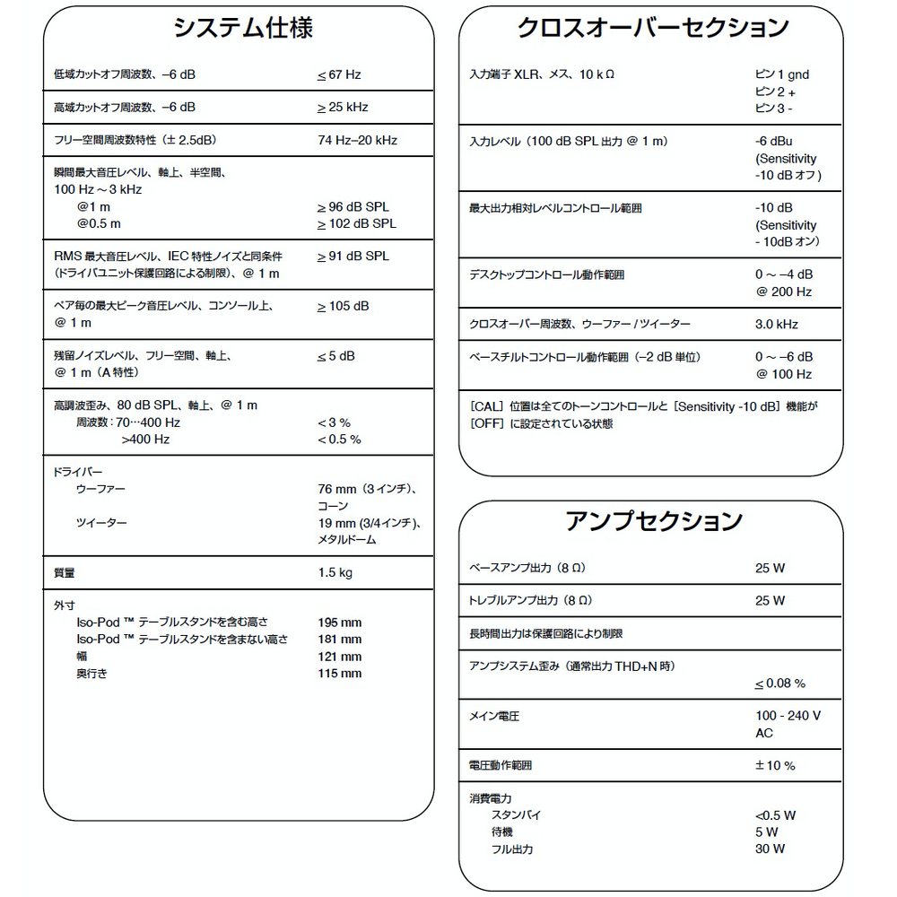 周波数特性(フリーフィールド):74 Hz ~ 20 kHz(±2.5 dB)/ 67 Hz ~ 25 kHz(-6 dB)