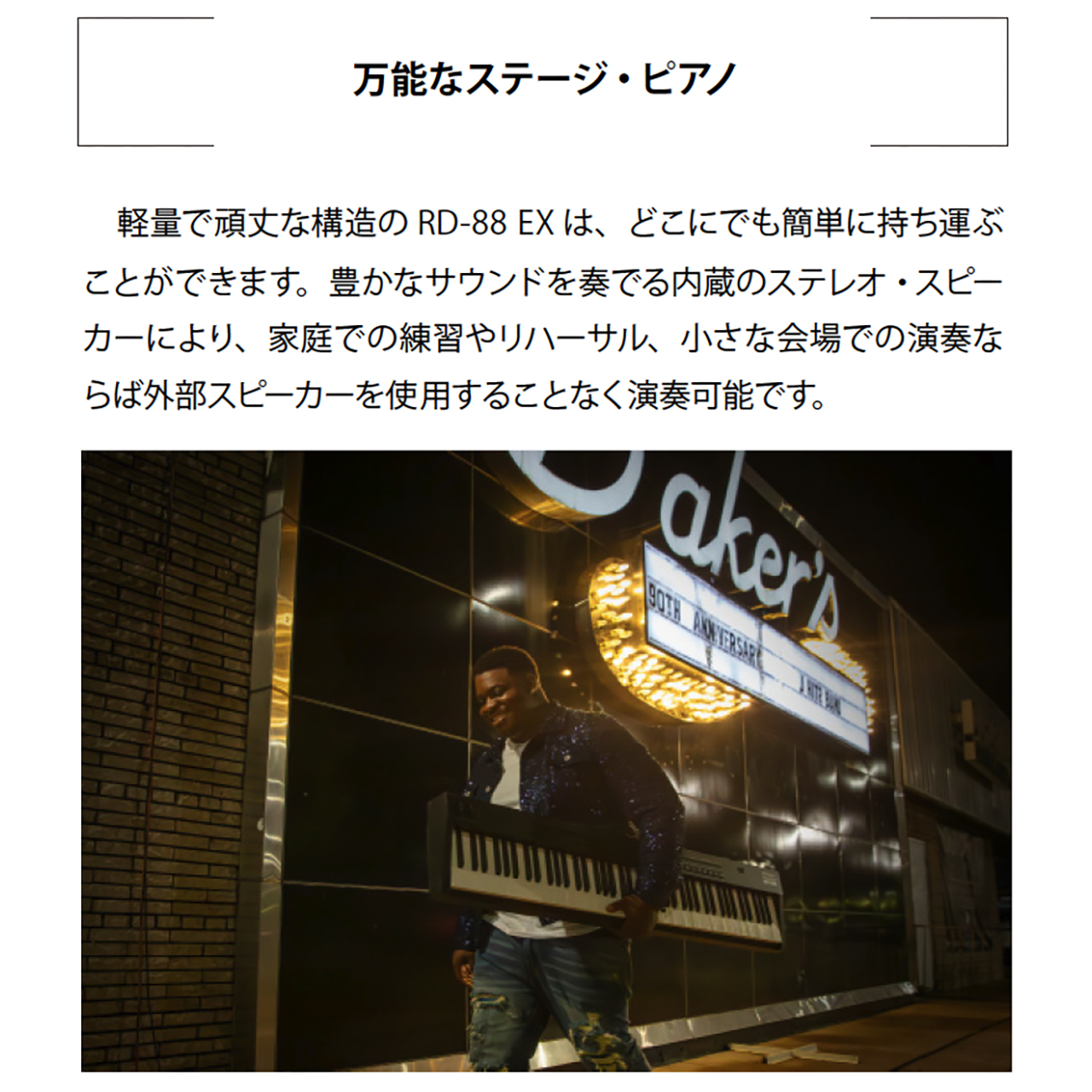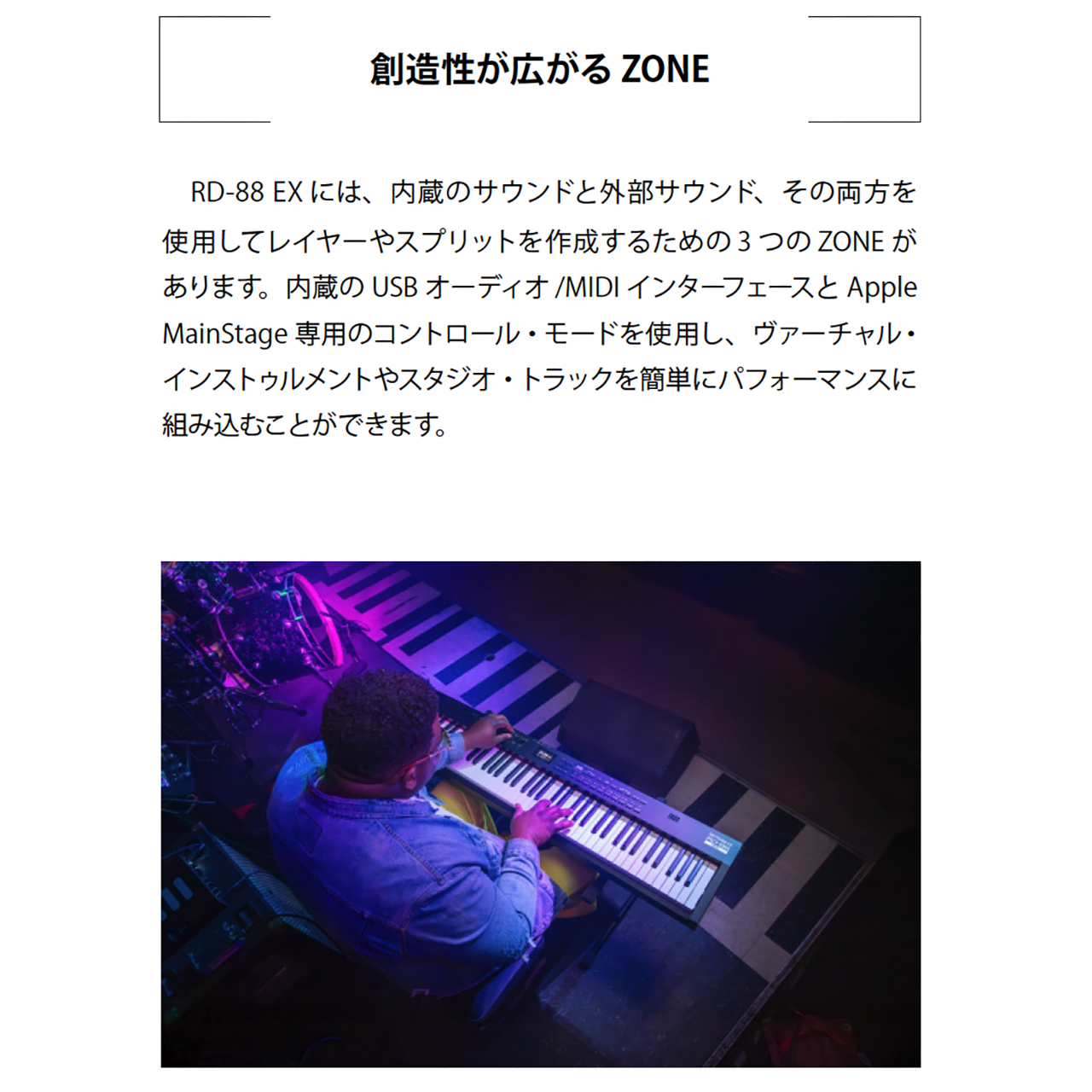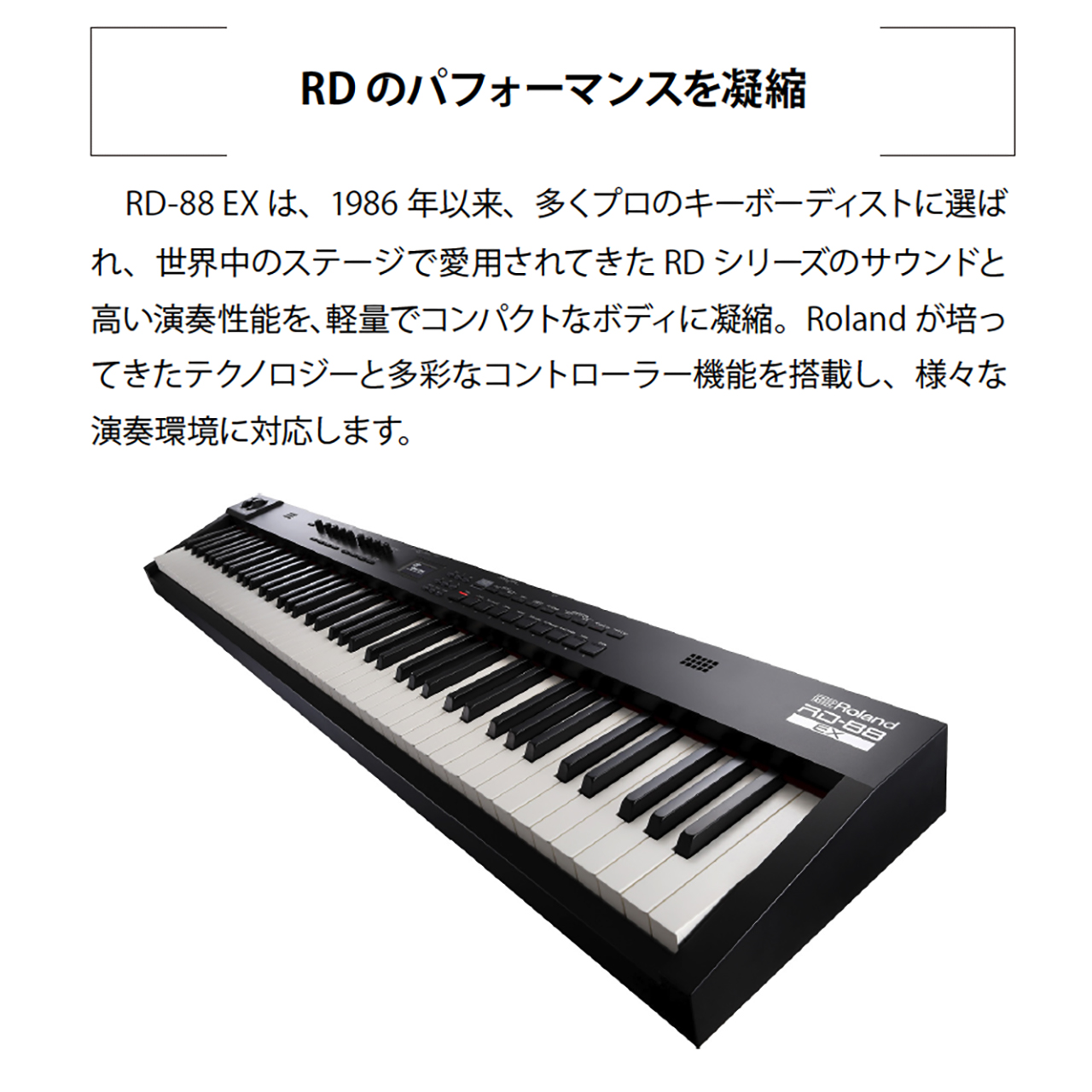RD-88 EXは、1986年以来、多くプロのキーボーディストに選ばれ、世界中のステージで愛用されてきたRDシリーズのサウンドと高い演奏性能を、軽量でコンパクトなボディに凝縮。