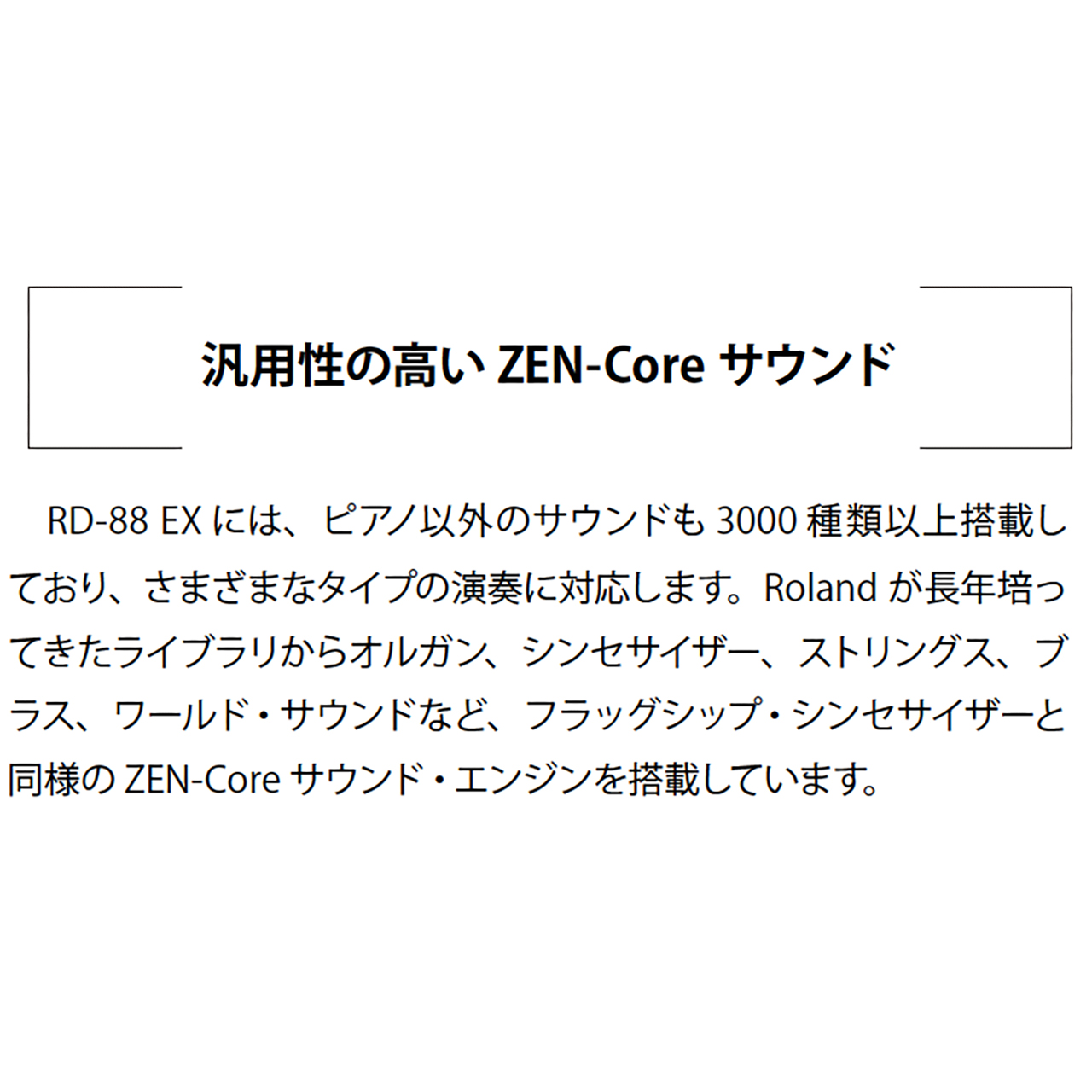 Rolandが長年培ってきたライブラリからオルガン、シンセサイザー、ストリングス、ブラス、ワールド・サウンドなど、フラッグシップ・シンセサイザーと同様のZEN-Coreサウンド・エンジンを搭載しています。