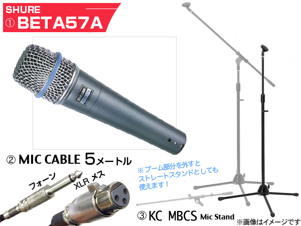 SHURE シュア BETA57A 三脚マイクスタンドSET(フォーン-XLR) ◆ ブームタイプ/ストレート両対応のスタンドと5mのケーブル のセット