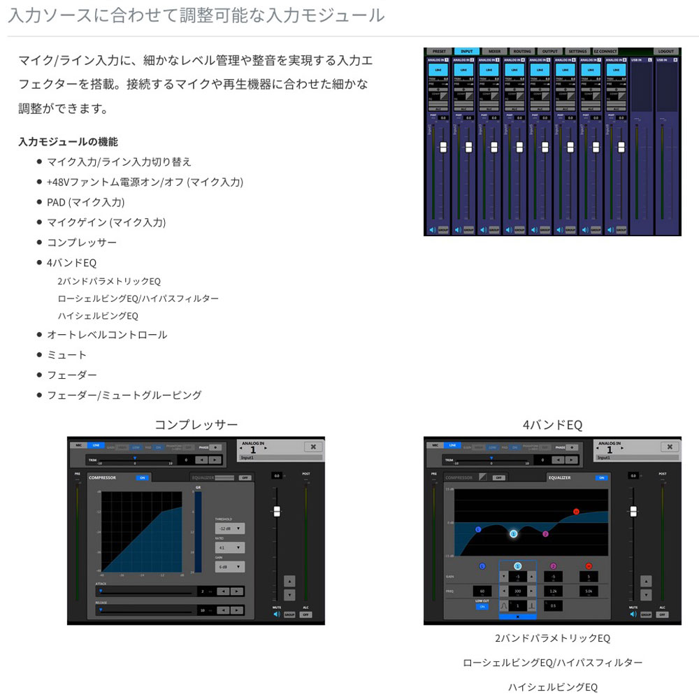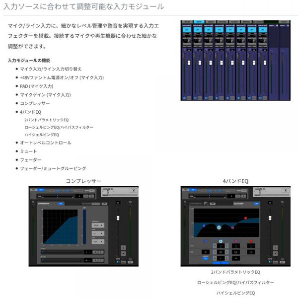 マイク/ライン入力にコンプレッサーや4バンドEQ、オートレベルコントロールなどの機能を搭載。