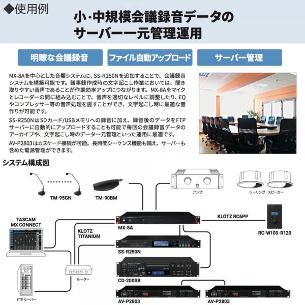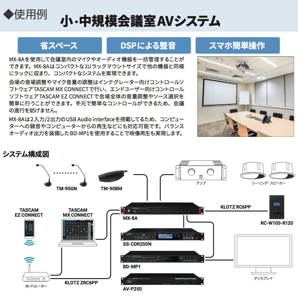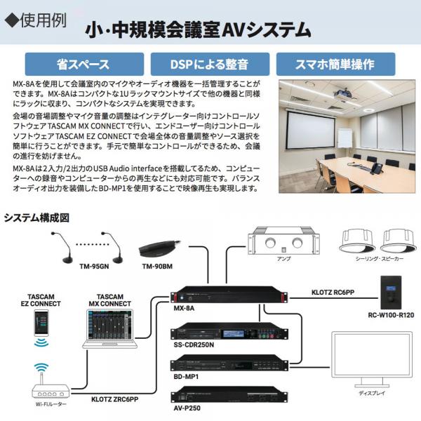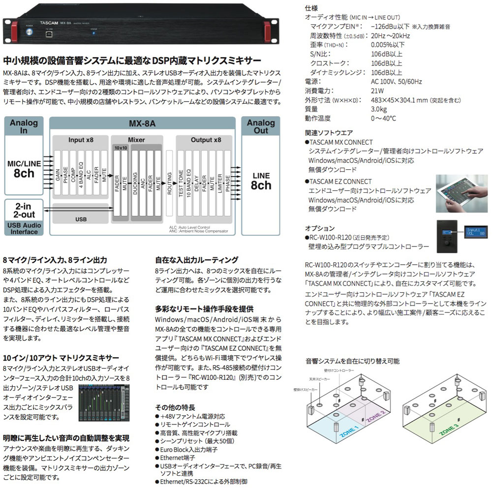コントロールソフトウェアにより本体のコントロールが可能。システム全体の設計や設定を行うシステムインテグレーター/管理者向け『TASCAM MX CONNECT』と、シンプルな操作に徹するエンドユーザー向け『TASCAM EZ CONNECT』の2タイプを利用できます。Windows/macOS/Android/iOSに対応しています。