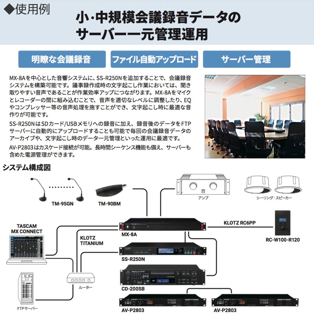 DSPエフェクターを活用可能なマトリクスミキサーを搭載。マイクや再生機器の音声を8エリア分ミックスするシステムの構築を実現します。