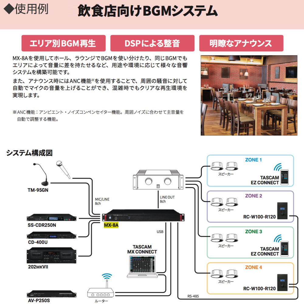 TASCAM タスカム MZ-372 ◆ 様々な入力ソースを 1 台で集中管理可能な業務用ミキサー 2ゾーンに対応
