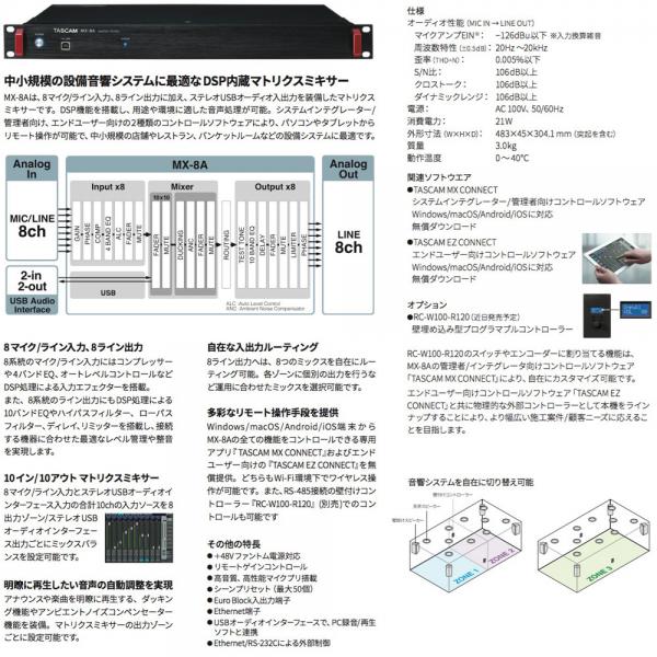 『MX-8A』は、8マイク/ライン入力、8ライン出力を装備したマトリクスミキサーです。DSP機能を搭載し、用途や環境に適した音声処理が可能。