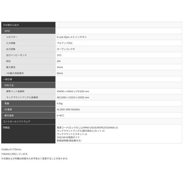 ・8イン/8アウトのGPIO端子を装備、TASCAM Sonicviewと接続時、拡張端子として使用可能(スタンドアローン運用時はローカル制御に対応可能)