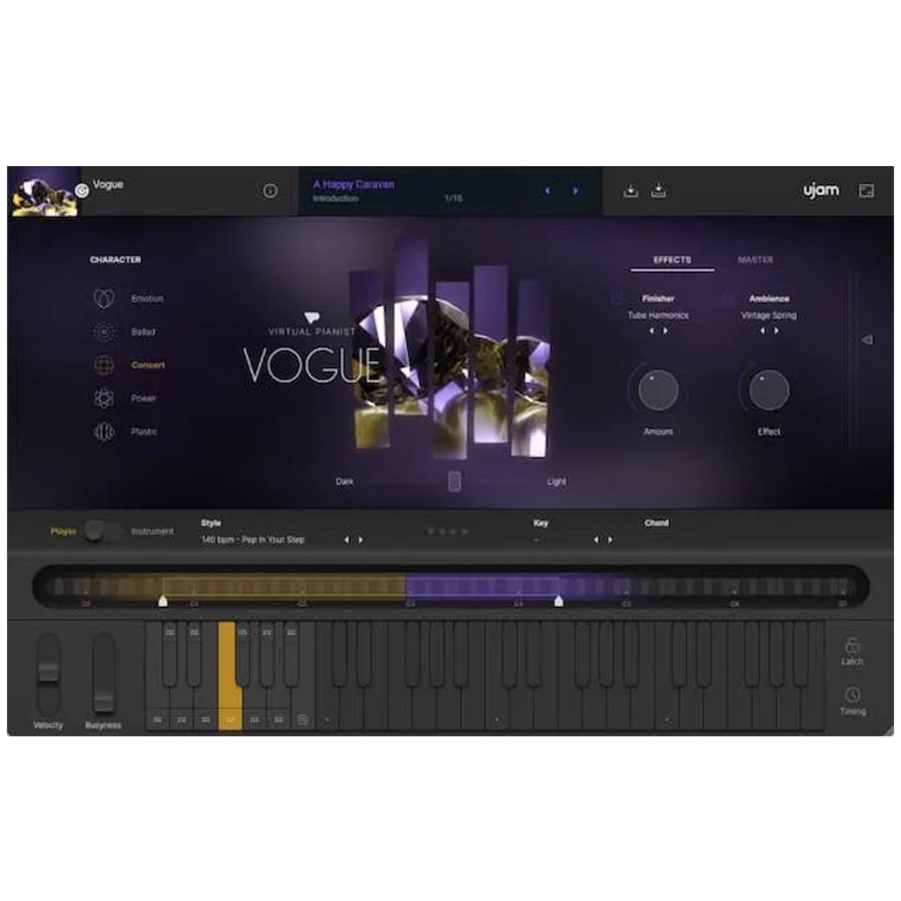 VOGUEは、ピアノ演奏スキルがなくてもフローを止めずに、まるで最高のピアノを奏でるエンターテイナーが弾いたようなトラックを素早く賢くプロデュースすることができます。