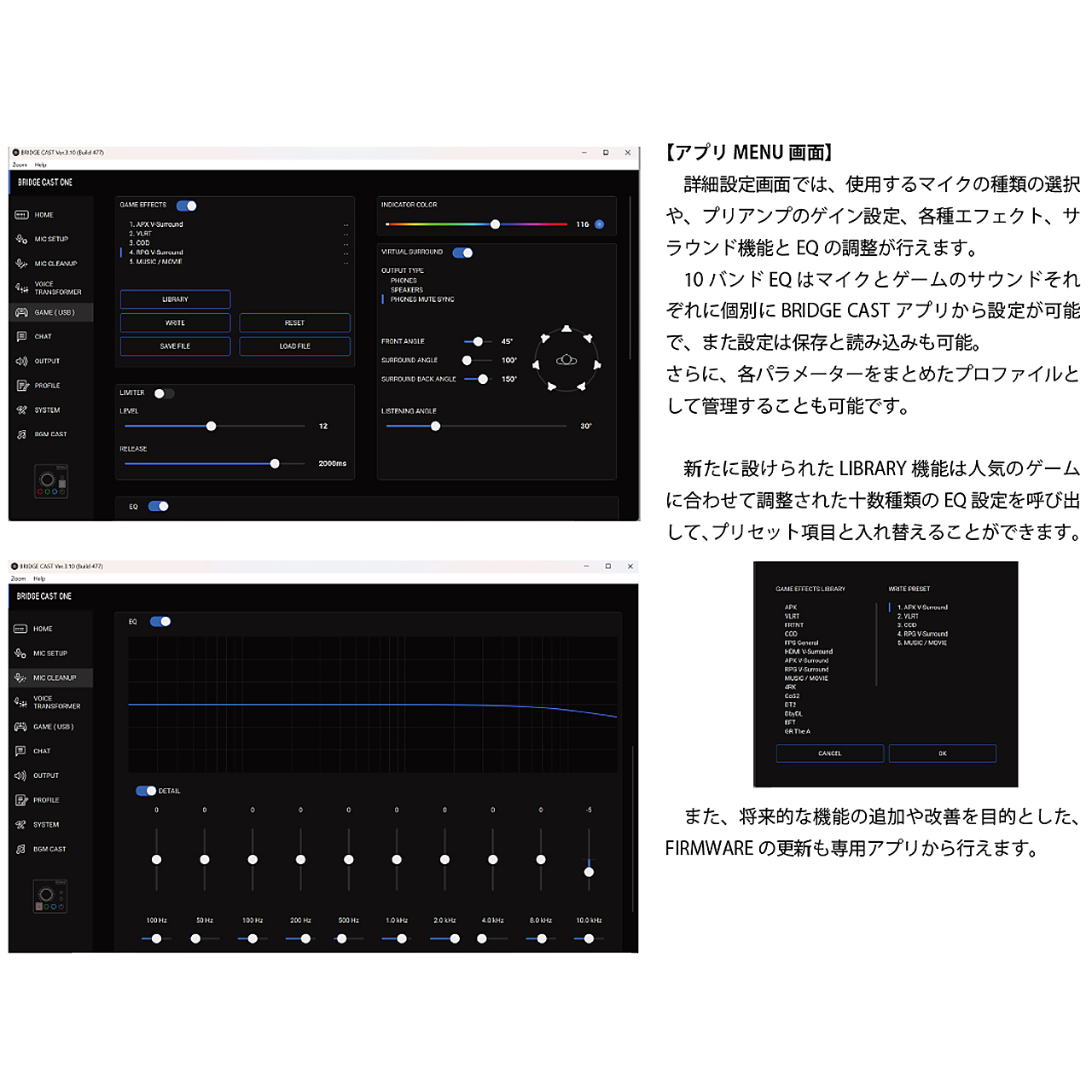 BRIDGE CAST ONE はBRIDGE CAST シリーズから引き継いだ、高ゲインを誇るマイク用プリアンプや強力なDSP によるサウンド処理を、高い操作性を保ちながら手のひらサイズに詰め込んだモデルです。