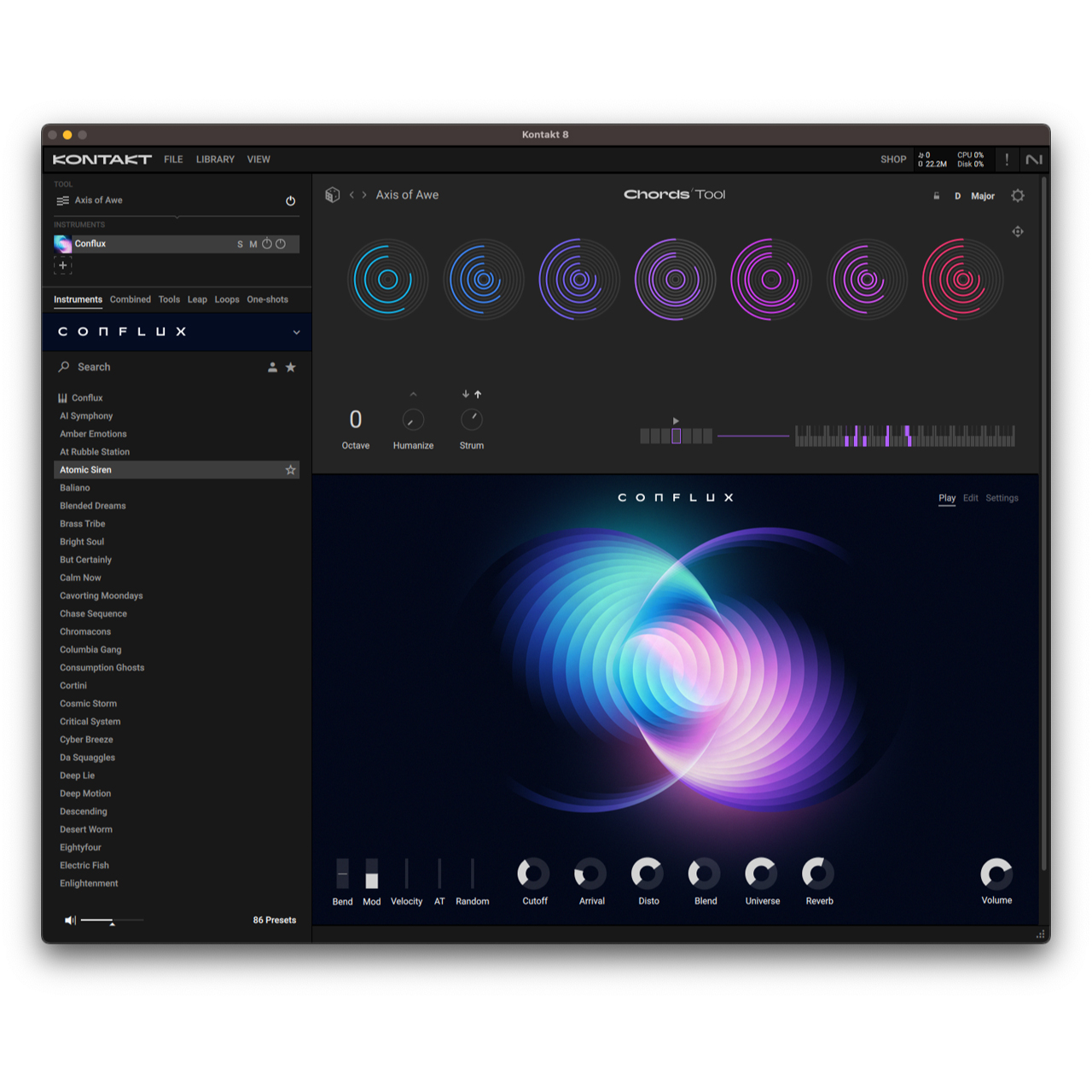 “Combined”カテゴリでは複数のインストゥルメントを含むプリセットや、新旧ライブラリを複合した新しい強化プリセットにアクセスできます。これらは、Conflux、Kithara、そしてKontakt Factory Libraryのインストゥルメントによる演奏をよりインスピレーションあふれる方法に変えるツールとして組み合わせたものです。