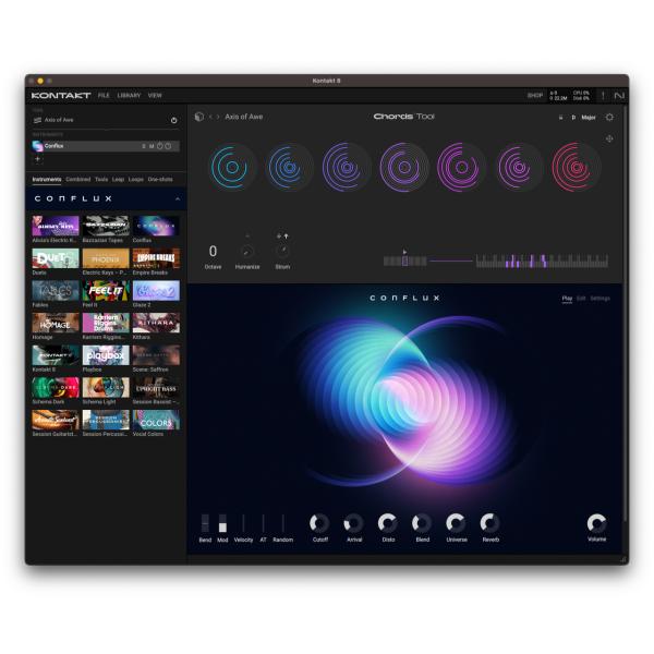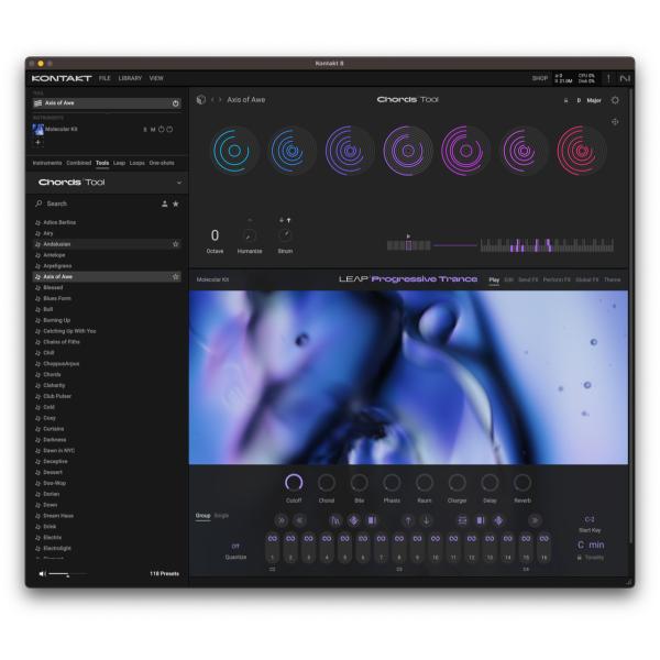 ・コードとフレーズのツールはMIDIコンテンツとランダマイズ機能を提供し、メロディやシーケンスを素早く作成して新しいアイデアを生み出します。この機能は新旧のあらゆるKontaktインストゥルメントと互換性があります。
