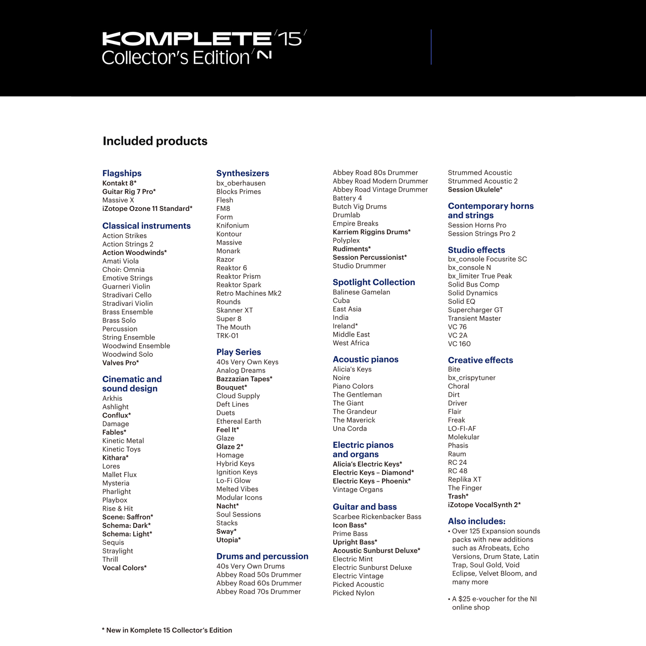 Komplete 15 Collector's Editionには、シンセプリセット、ドラムキット、ワンショット、サンプル、ループを含む125以上のジャンル別Expansionサウンドパックが収録されています。
