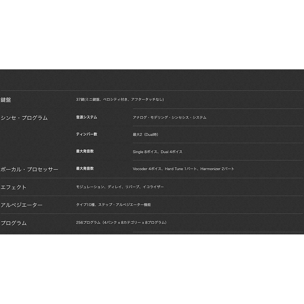 37鍵(ミニ鍵盤、ベロシティ付き、アフタータッチなし) |