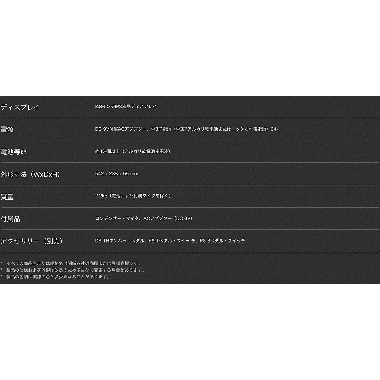 付属のACアダプターに加えて単3形電池6本でも動作し、幅54.2cm、重さ2.1kg(本体のみ。電池、マイク除く)と持ち運びにも便利なサイズで好きな場所に自由に持ち出して演奏することができます。