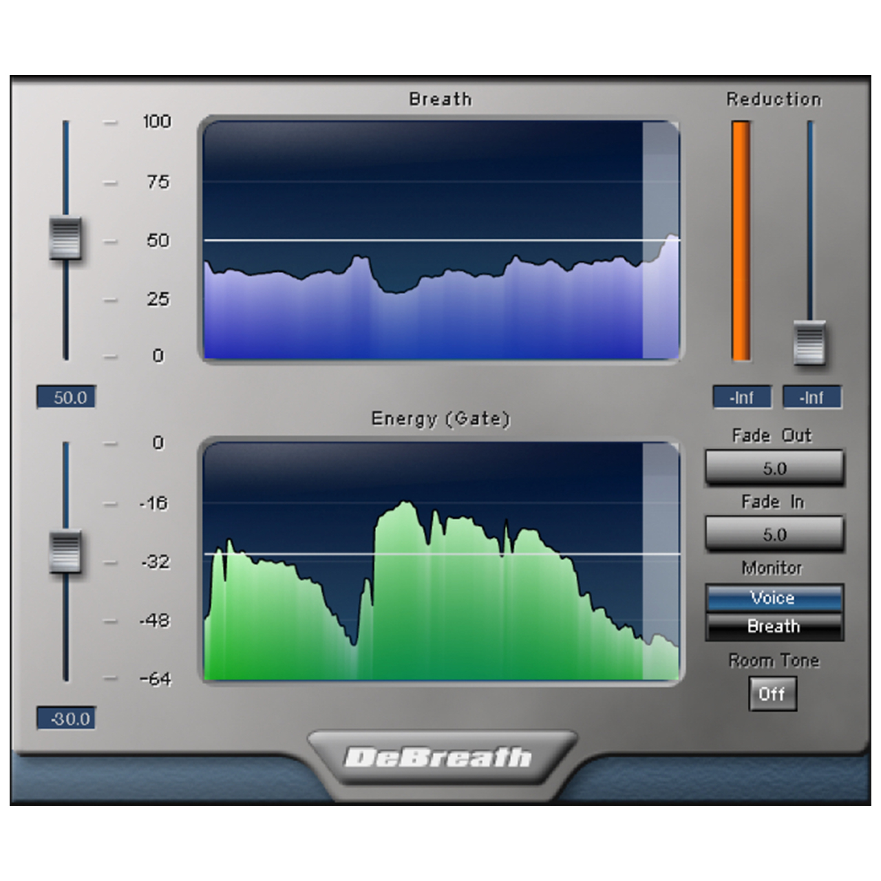 DeBreathはボーカルトラックのブレスノイズを自動で減らしたり取り除いたりする革新的なプラグインです。ブレスセグメントを検出し、メインボーカルと分離させるユニークなテンプレート照合アルゴリズムを採用しており、オーディオ信号のブレスノイズをそれ以外の部分にまったく影響を与えることなく減らしたり除去できるのです。ブレスノイズを除去したり減らしたりする際失われるルームノイズを補正するため、ルームノイズを加えることも可能です。