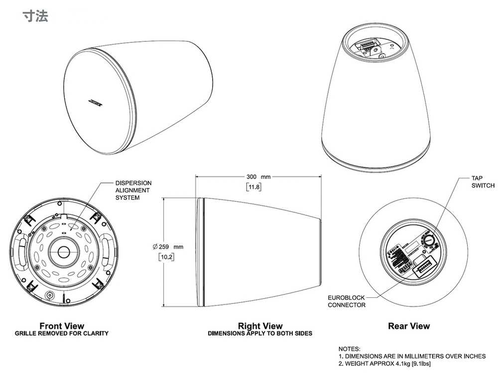 ・製品寸法(エンクロージャー直径 × 奥行き) :259 × 300 mm