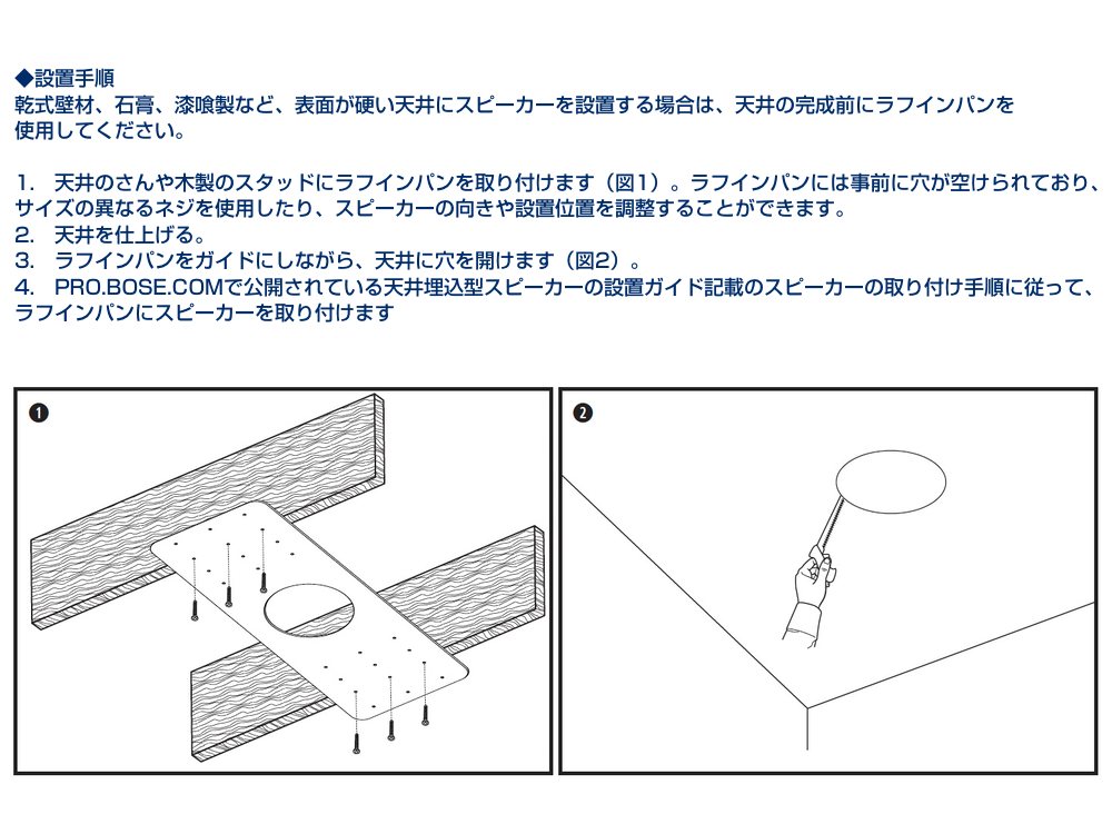 4. PRO.BOSE.COMで公開されている天井埋込型スピーカーの設置ガイド記載のスピーカーの取り付け手順に従って、ラフインパンにスピーカーを取り付けます