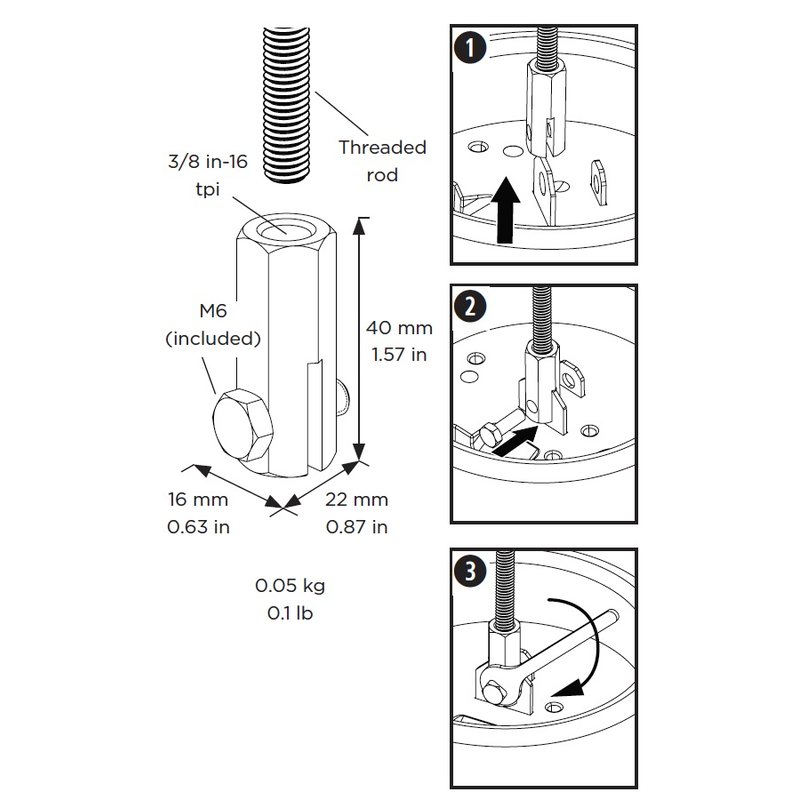 3/8インチのネジ込み式ロッドハードウェアからDesignMaxペンダントマウント型スピーカーへのサスペンション用として設計されています。
