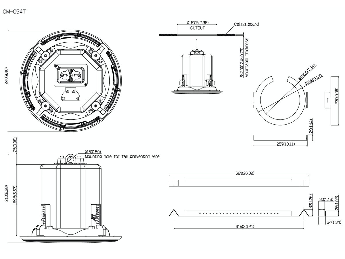 設置の安全性と容易性を考慮し、本体部にはワンタッチのばね式天井取付用タブを、スピーカーグリル部には落下防止機能付きスライドロック機構を採用しました。設置状態の安全性を高めるCリングとタイルブリッジを付属。さらに難燃性を考慮した設計で、米国の安全規格UL1480A、UL2043の認証を取得