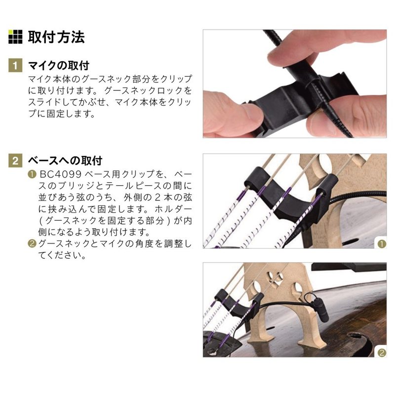■付属のベース用クリップ(BC4099)は弦を挟み込む固定方法のため、楽器の響きに影響を与えません。