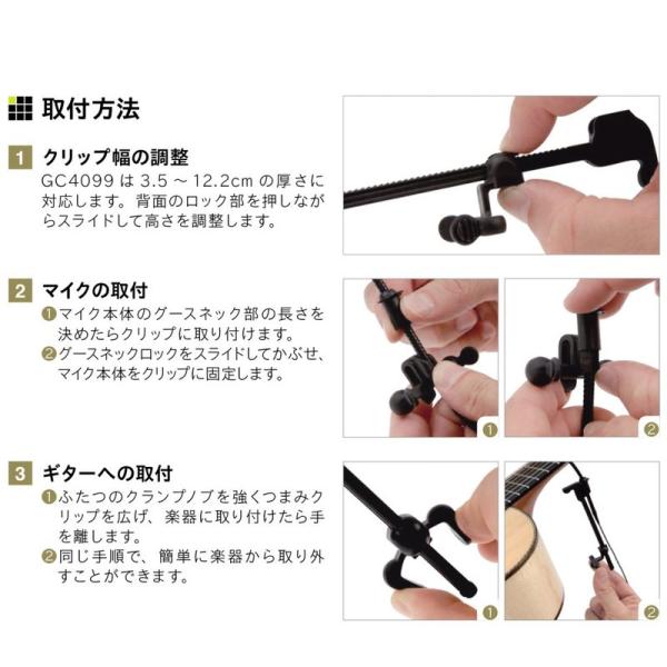 ■付属のギター用クリップ(GC4099)は、厚み3.5cm~12.2cmの楽器に対応します。