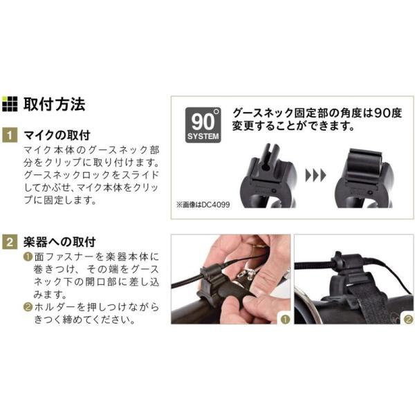 ■付属のユニバーサル・クリップ(UC4099)は、面ファスナーを使用しており、様々な形状の楽器にしっかりフィットします。マイクスタンドにも固定できます。