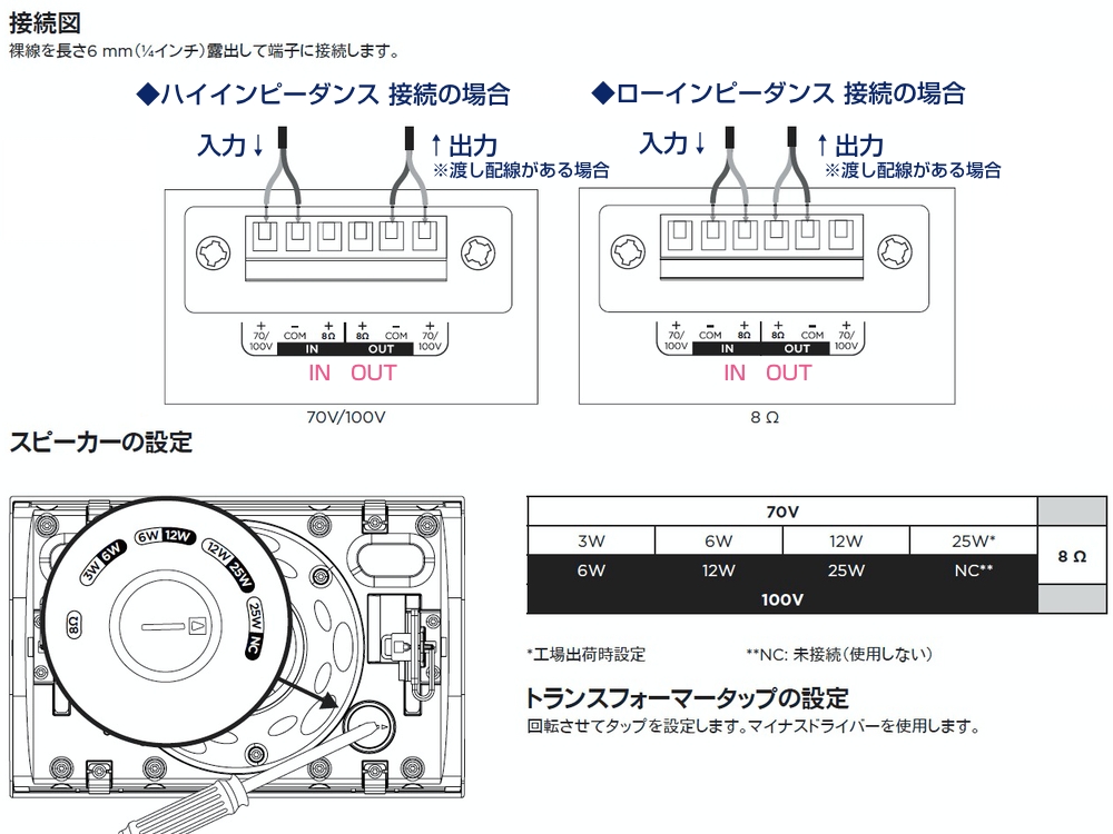 ( 70V伝送時:3W/6W/12W/25W、100V伝送時:6W/12W/25W )