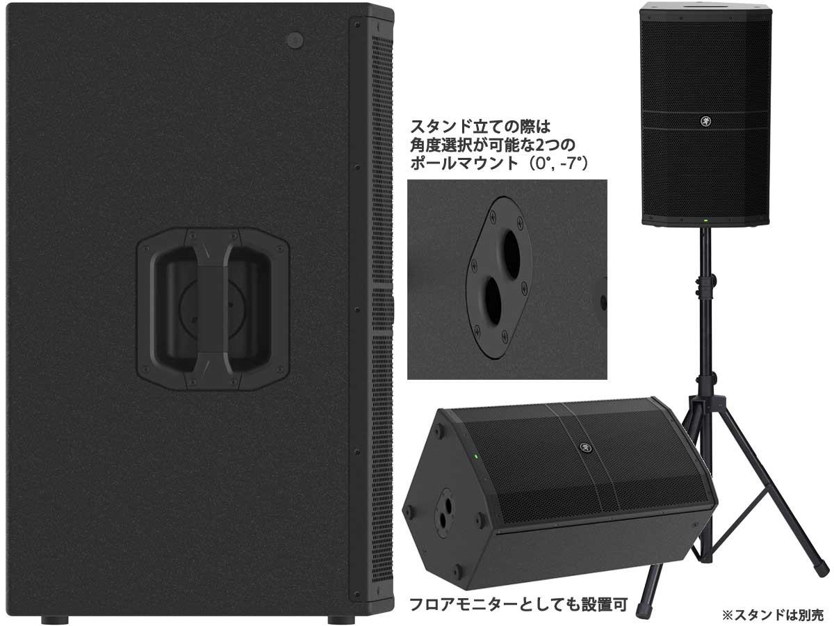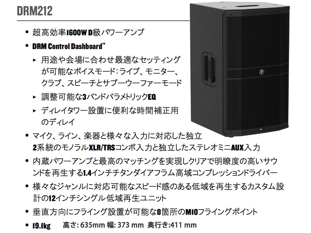 クラス上位のハイコントラスト、フルカラーディスプレイを実装したDRM Control Dashboardは、EQの設定や高解像度レベルメーターなど現在の状態を瞬時に確認することができます。内部を支柱で補強し、“戦車級に頑丈な”合板エンクロージャーを採用し苛酷なツアリングにも対応します。また内蔵パワーアンプとのマッチングを取ったクリアで明瞭度の高いサウンドを再生するカスタム設計のスピーカーユニットを実装し、真のプロフェッショナルサウンドを実現します。ブラケット固定のM10フライポイントやデュアルアングルポールマウントを装備、さらにDRM12Aはラインアレイシステムを構築することができライブイベントから常設設備まで様々な用途で使用することが可能です。電源がスピーカーの近くに無いですか。ご安心ください。電源不要のパッシブヴァージョンもご用意してます。