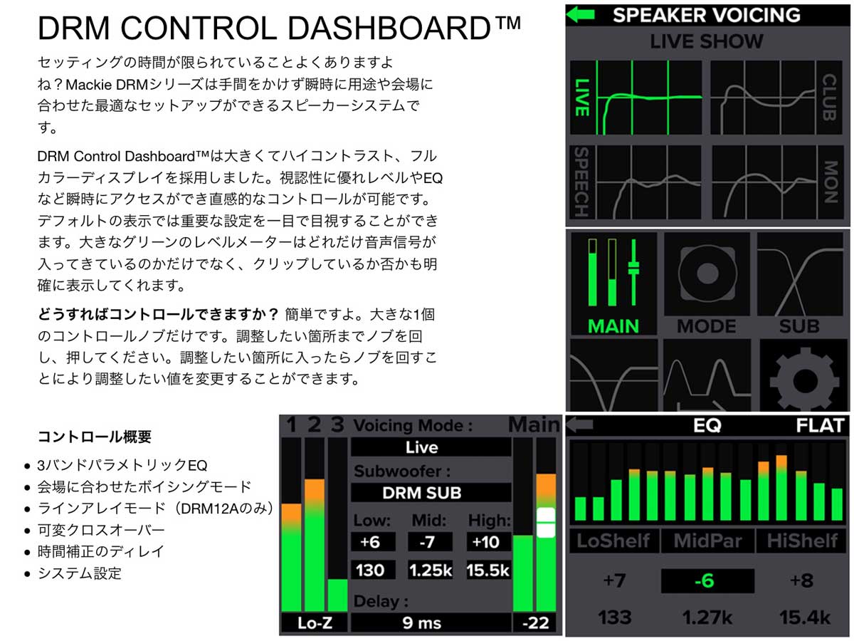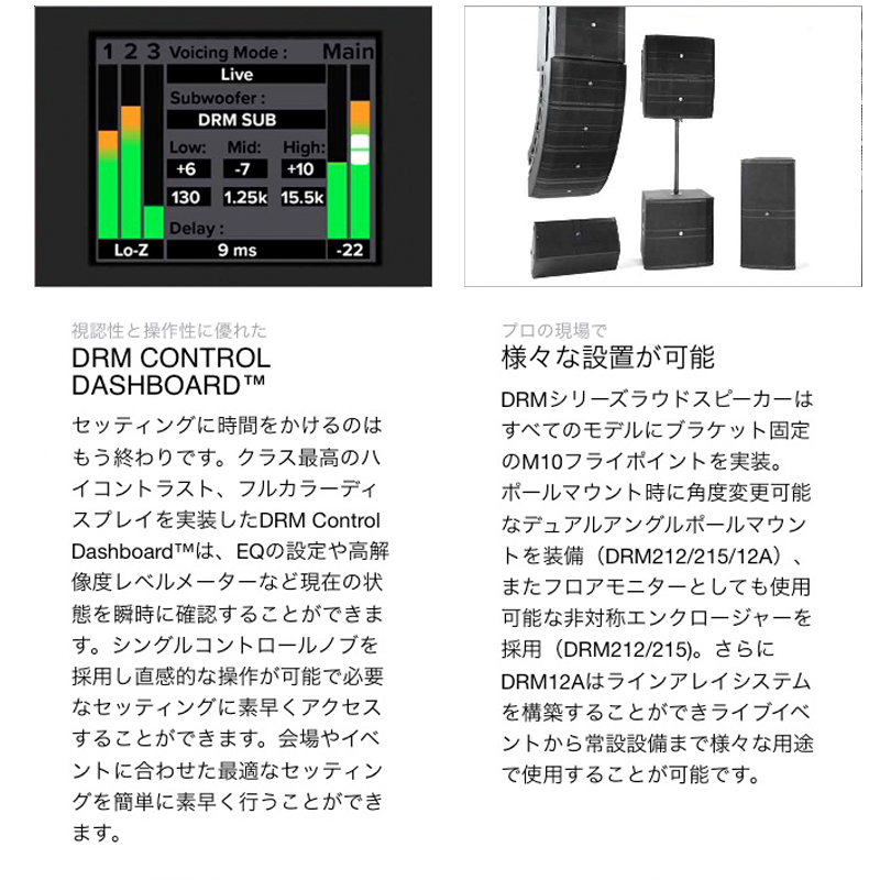 DRMシリーズパワードラウドスピーカーはクラス上位のハイパワー出力とAdvanced Impulse  DSPを搭載し会場や用途に合わせて最適なサウンドを再生します。背面パネルにはDRM Control Dashboardを搭載。クラス上位のハイコントラスト、フルカラーディスプレイを備えており、誰でもすばやく簡単に現場に合わせたセッティングが可能です。